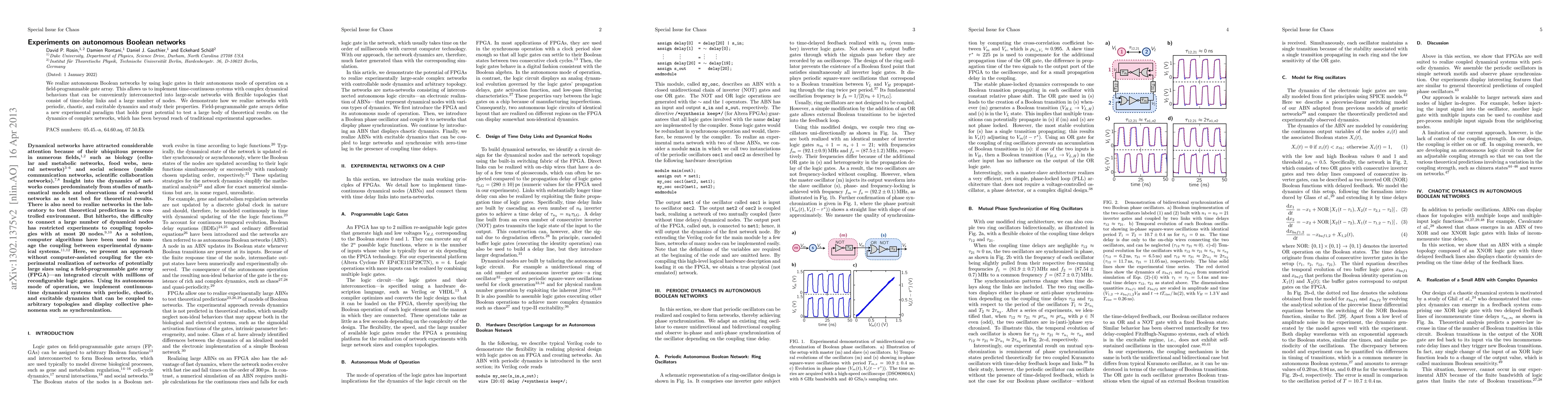 We realize autonomous Boolean networks by using logic gates in their autonomous mode-of-operation on a field-programmable gate array. This allows us to implement time-continuous systems with complex dynamical behaviors that can be conveniently interconnected into large-scale networks with flexible topologies that consist of time-delay links and a large number of nodes. We demonstrate how we realize networks with periodic, chaotic, and excitable dynamics and study their properties. Field-programmable gate arrays define a new experimental paradigm that holds great potential to test a large body of theoretical results on the dynamics of complex networks, which has been beyond reach of traditional experimental approaches.