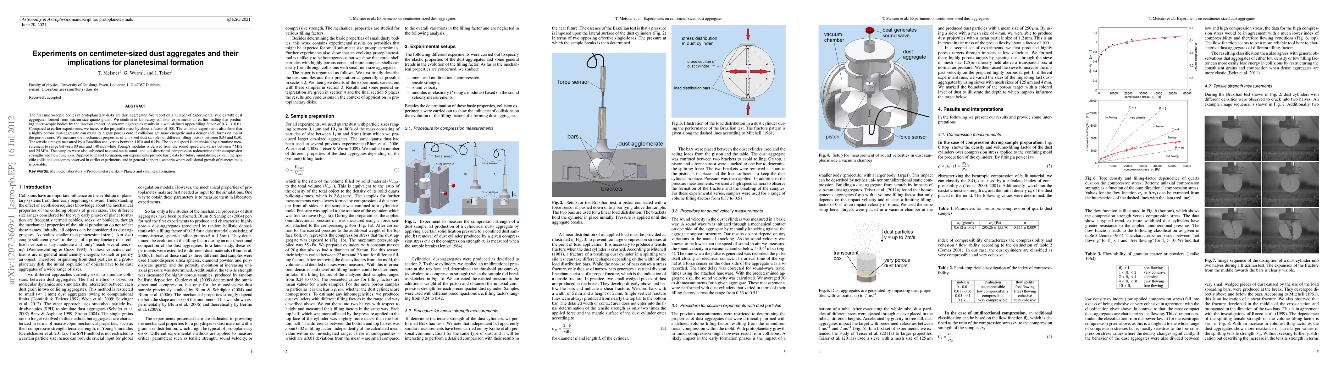This study experimentally investigates centimeter-sized dust aggregates formed from micron-sized quartz grains, confirming an upper-filling factor of 0.31 ± 0.01 and revealing that highly porous aggregates can maintain their structure under energetic collisions. The research provides mechanical properties data essential for planetesimal formation simulations.