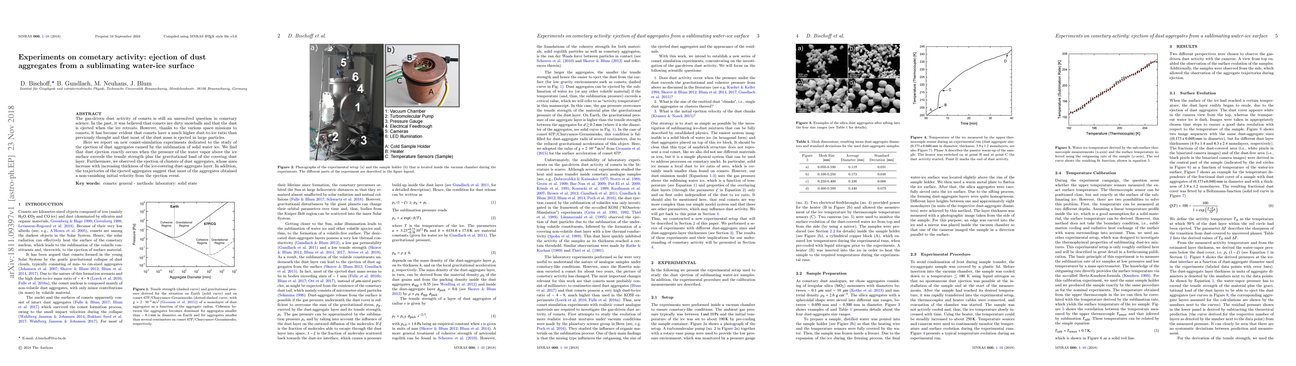 This research investigates the ejection of dust aggregates from sublimating water-ice surfaces in comets, revealing that dust is expelled when vapor pressure exceeds the tensile strength and gravitational load of the dust layer. The study finds that larger dust aggregates are ejected in clusters, gaining initial velocity from the ejection event.