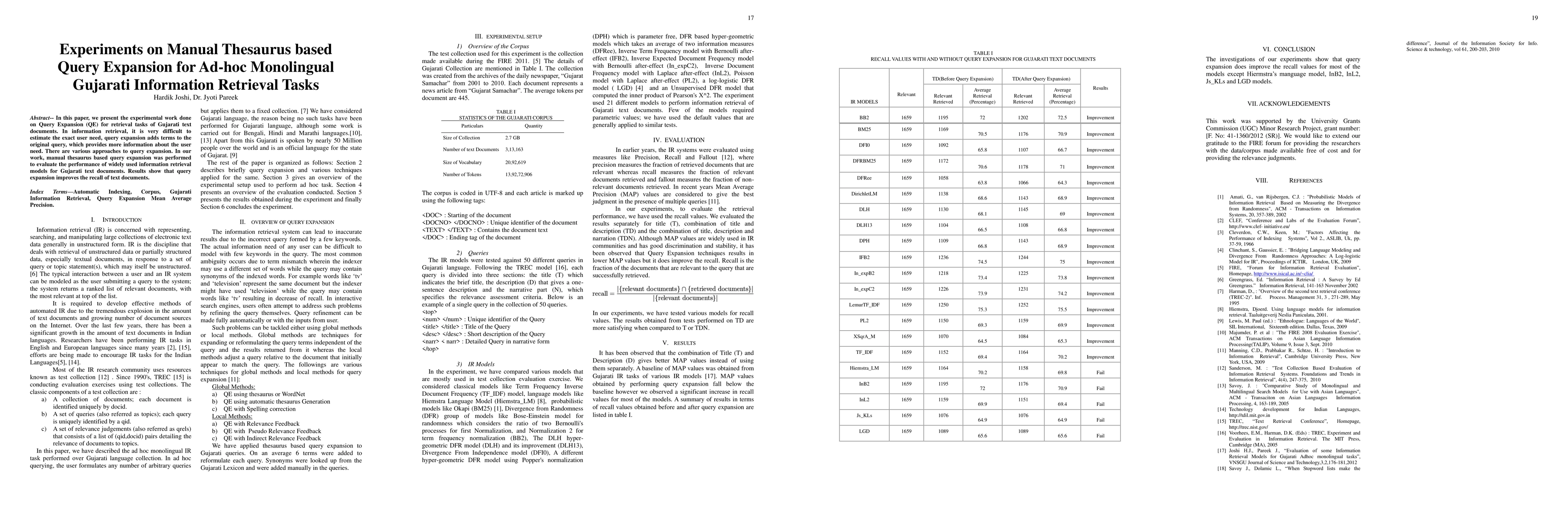 This paper investigates manual thesaurus-based query expansion for Gujarati text document retrieval, demonstrating that it enhances recall by adding relevant terms to the original query. Experimental results show improved performance of information retrieval models using this method.