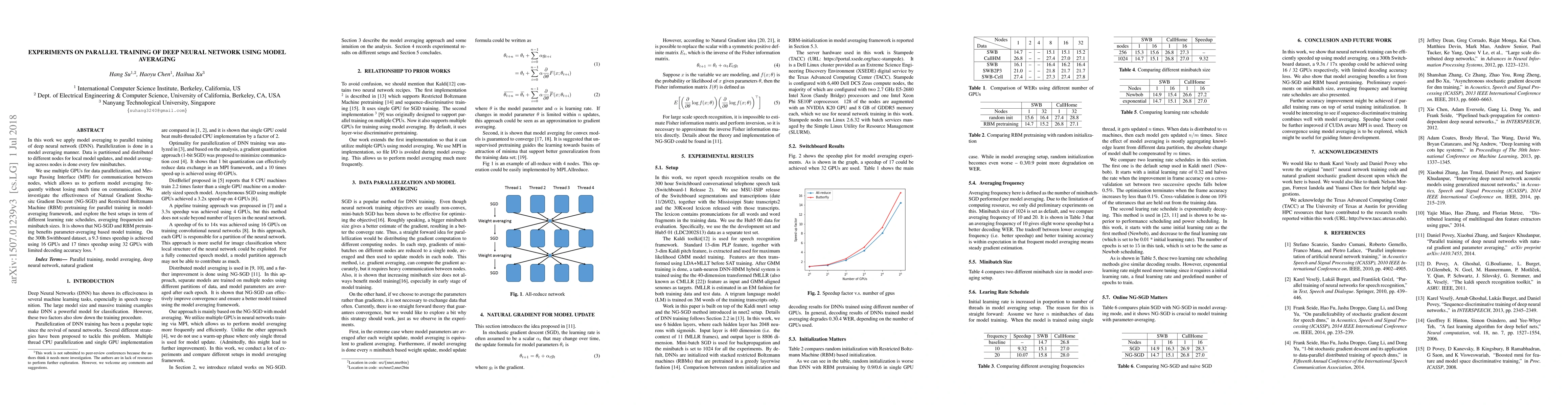 This paper explores parallel training of deep neural networks using model averaging, employing data partitioning and frequent model averaging across multiple GPUs. It investigates the effectiveness of NG-SGD and RBM pretraining, achieving significant speedups (9.3x with 16 GPUs and 17x with 32 GPUs) on the Switchboard dataset with minimal loss in decoding accuracy.
