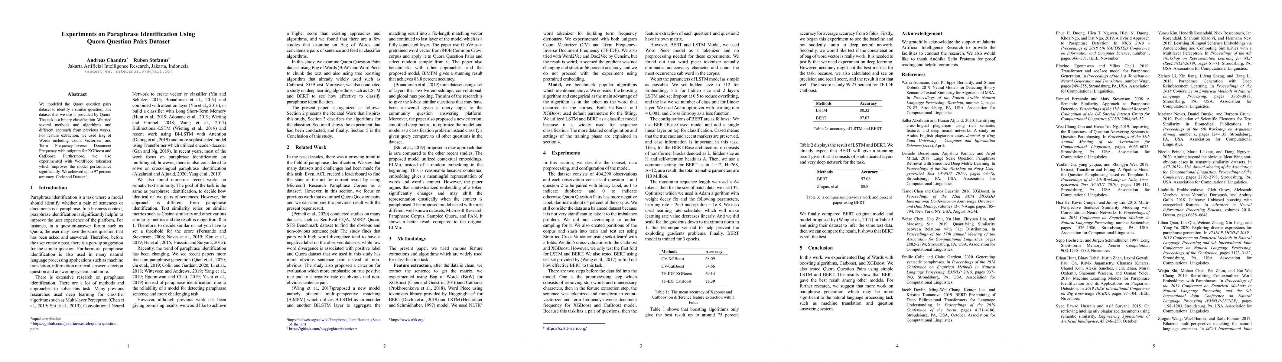 We modeled the Quora question pairs dataset to identify a similar question. The dataset that we use is provided by Quora. The task is a binary classification. We tried several methods and algorithms and different approach from previous works. For feature extraction, we used Bag of Words including Count Vectorizer, and Term Frequency-Inverse Document Frequency with unigram for XGBoost and CatBoost. Furthermore, we also experimented with WordPiece tokenizer which improves the model performance significantly. We achieved up to 97 percent accuracy. Code and Dataset.