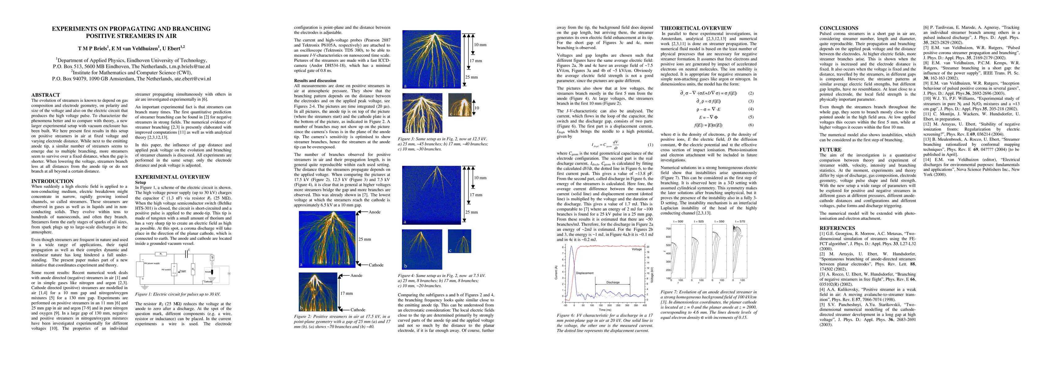 This proceedings paper from 2004 contains figures of discharges in different gap lengths at the same potential that are not available elsewhere. The 2004 abstract: The evolution of streamers is known to depend on gas composition and electrode geometry, on polarity and size of the voltage and also on the electric circuit that produces the high voltage pulse. To characterize the phenomena better and to compare with theory, a new larger experimental setup with vacuum enclosure has been built. We here present first results in this setup on positive streamers in air at fixed voltage and varying electrode distance. While next to the emitting anode tip, a similar number of streamers seems to emerge due to multiple branching, more streamers seem to survive over a fixed distance, when the gap is shorter. When lowering the voltage, streamers branch less at all distances from the anode tip or do not branch at all beyond a certain distance.