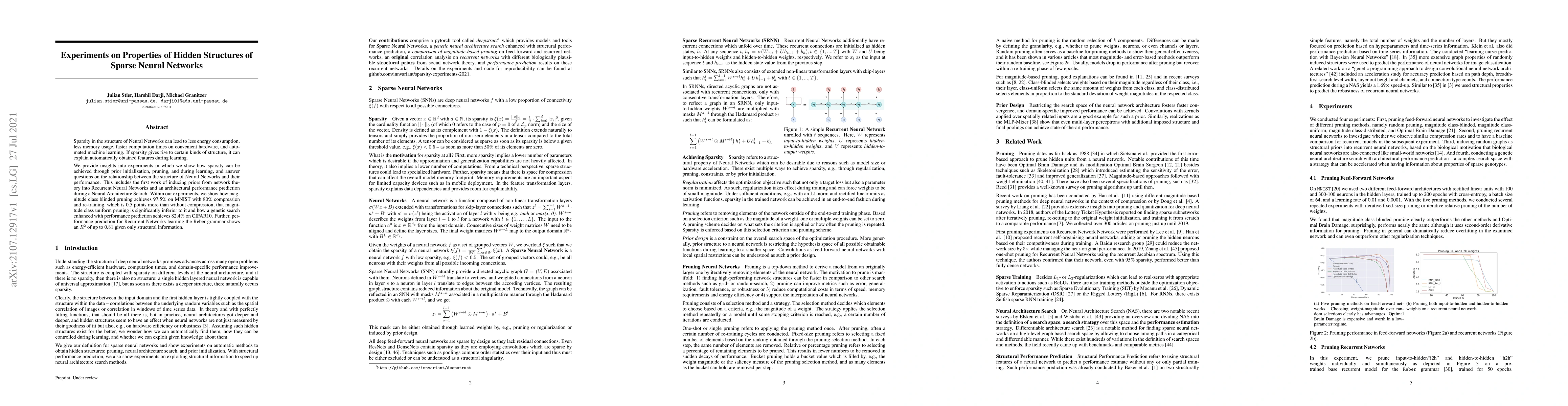 Sparsity in the structure of Neural Networks can lead to less energy consumption, less memory usage, faster computation times on convenient hardware, and automated machine learning. If sparsity gives rise to certain kinds of structure, it can explain automatically obtained features during learning. We provide insights into experiments in which we show how sparsity can be achieved through prior initialization, pruning, and during learning, and answer questions on the relationship between the structure of Neural Networks and their performance. This includes the first work of inducing priors from network theory into Recurrent Neural Networks and an architectural performance prediction during a Neural Architecture Search. Within our experiments, we show how magnitude class blinded pruning achieves 97.5% on MNIST with 80% compression and re-training, which is 0.5 points more than without compression, that magnitude class uniform pruning is significantly inferior to it and how a genetic search enhanced with performance prediction achieves 82.4% on CIFAR10. Further, performance prediction for Recurrent Networks learning the Reber grammar shows an $R^2$ of up to 0.81 given only structural information.