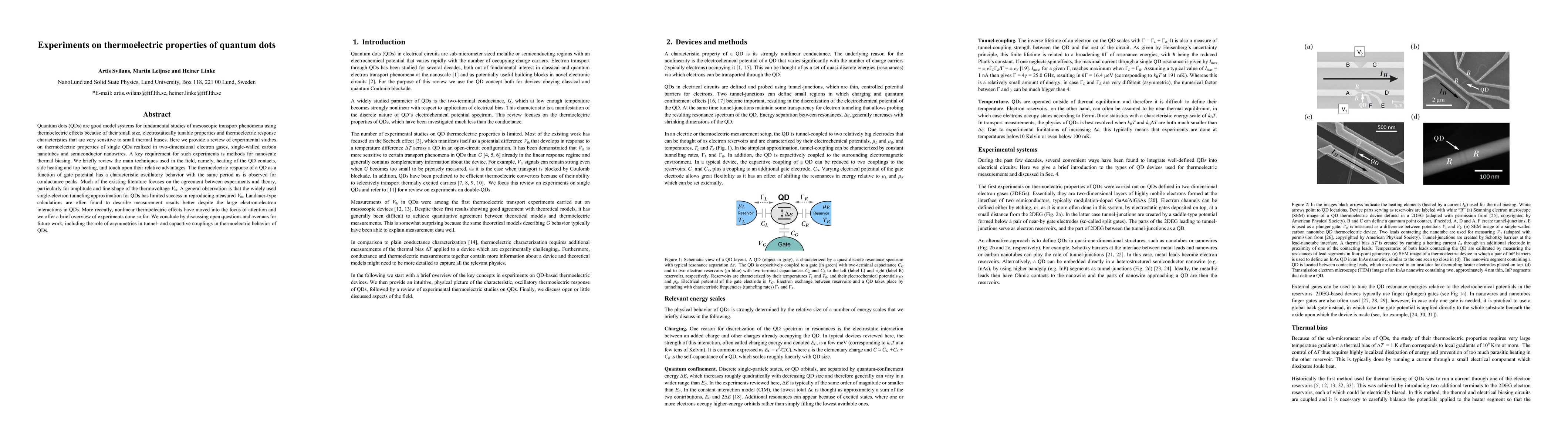 This paper reviews experimental studies on the thermoelectric properties of quantum dots (QDs) in various systems, highlighting oscillatory thermovoltage behavior and comparing experimental results with theoretical models. It discusses the limitations of single-electron tunneling approximations and the better fit of Landauer-type calculations, while also noting the emerging focus on nonlinear thermoelectric effects.