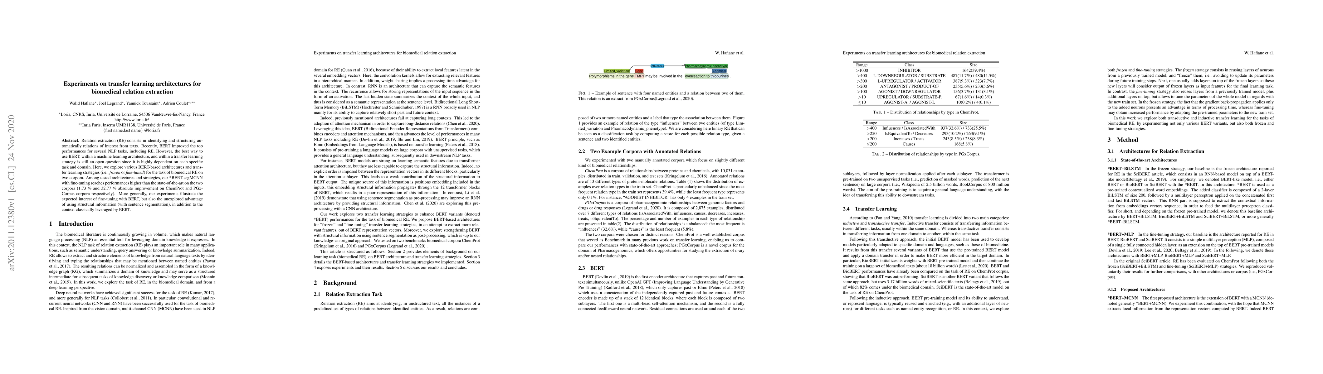 Relation extraction (RE) consists in identifying and structuring automatically relations of interest from texts. Recently, BERT improved the top performances for several NLP tasks, including RE. However, the best way to use BERT, within a machine learning architecture, and within a transfer learning strategy is still an open question since it is highly dependent on each specific task and domain. Here, we explore various BERT-based architectures and transfer learning strategies (i.e., frozen or fine-tuned) for the task of biomedical RE on two corpora. Among tested architectures and strategies, our *BERT-segMCNN with finetuning reaches performances higher than the state-of-the-art on the two corpora (1.73 % and 32.77 % absolute improvement on ChemProt and PGxCorpus corpora respectively). More generally, our experiments illustrate the expected interest of fine-tuning with BERT, but also the unexplored advantage of using structural information (with sentence segmentation), in addition to the context classically leveraged by BERT.
