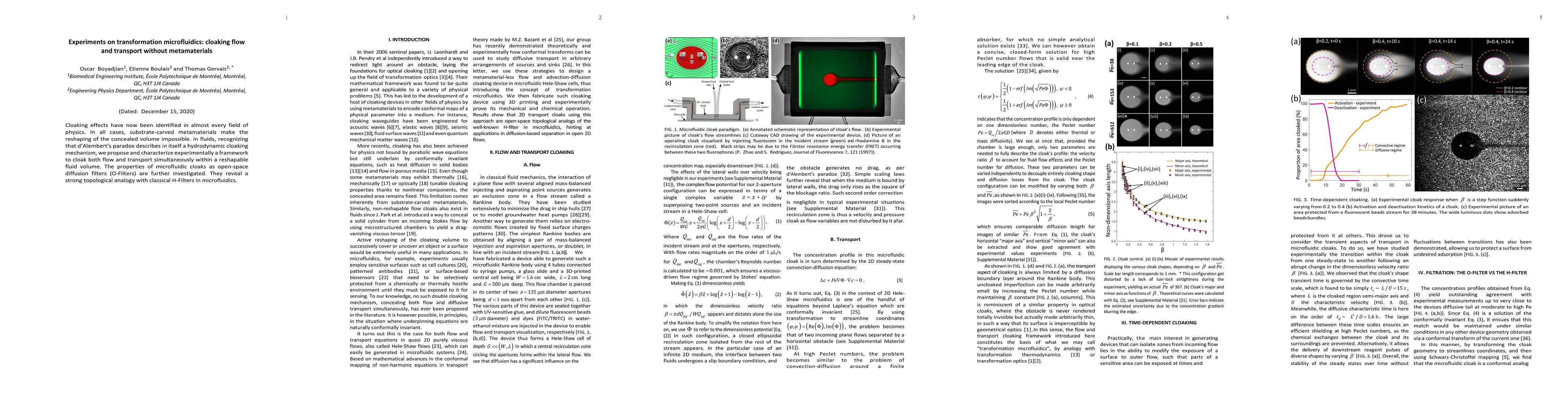 Cloaking effects have now been identified in almost every field of physics. In all cases, substrate-carved metamaterials make the reshaping of the concealed volume impossible. In fluids, recognizing that d'Alembert's paradox describes in itself a hydrodynamic cloaking mechanism, we propose and characterize experimentally a framework to cloak both flow and transport simultaneously within a reshapable fluid volume. The properties of microfluidic cloaks as open-space diffusion filters (O-Filters) are further investigated. They reveal a strong topological analogy with classical H-Filters in microfluidics.