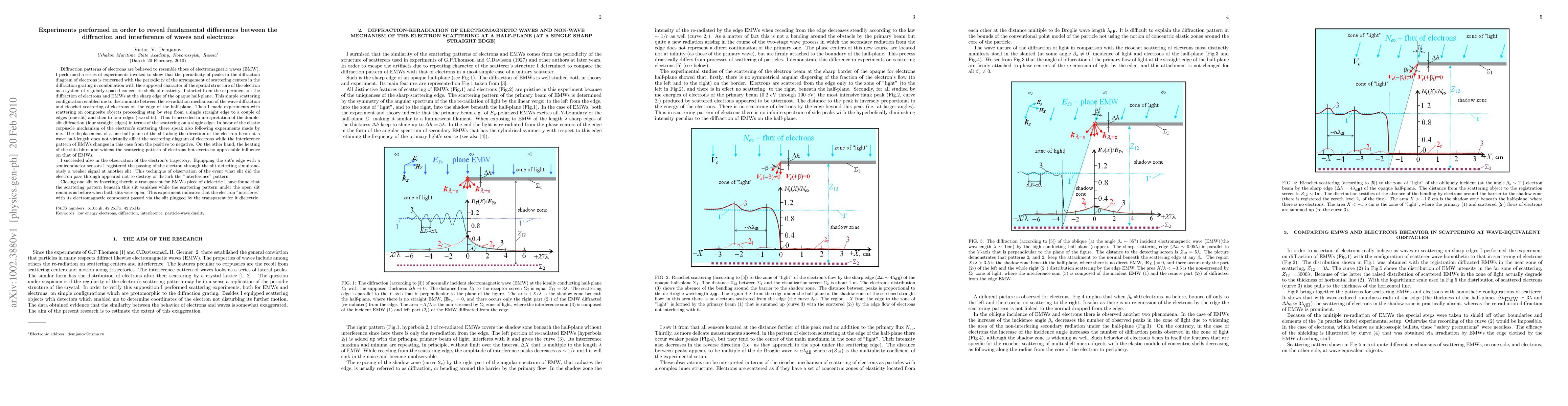 Diffraction patterns of electrons are believed to resemble those of electromagnetic waves (EMW). I performed a series of experiments invoked to show that the periodicity of peaks in the diffraction diagram of electrons is concerned with the periodicity of the arrangement of scattering centers in the diffraction grating in combination with the supposed character of the spatial structure of the electron as a system of regularly spaced concentric shells of elasticity. I started from the experiment on the diffraction of electrons and EMWs at the sharp edge of the opaque half-plane. This simple scattering configuration enabled me to discriminate between the re-radiation mechanism of the wave diffraction and ricochet scattering of electrons on the edge of the half-plane. Then I made experiments with scattering on composite objects proceeding step by step from a single straight edge to a couple of edges (one slit) and then to four edges (two slits). Thus I succeeded in interpretation of the double-slit diffraction (four straight edges) in terms of the scattering on a single edge. I managed also to observe the electron's trajectory. Equipping the slit's edge with a semiconductor sensors I registered the passing of the electron through the slit detecting simultaneously a weaker signal at another slit. This technique appeared not to destroy or disturb the "interference" pattern. Closing one slit by inserting therein a transparent for EMWs piece of dielectric I have found that the scattering pattern beneath this slit vanishes while the scattering pattern under the open slit remains as before when both slits were open. This experiment indicates that the electron "interferes" with its electromagnetic component passed via the slit plugged by the transparent for it dielectric.