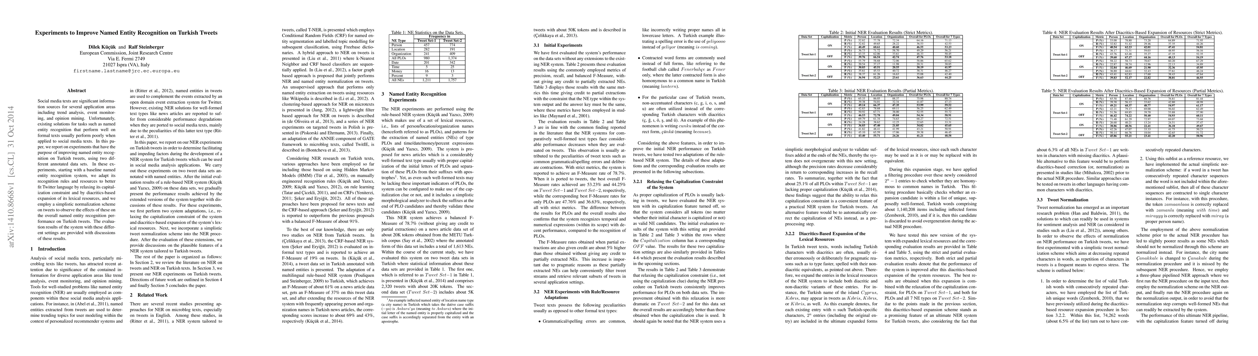 This paper experiments with improving named entity recognition (NER) on Turkish tweets by adapting a baseline NER system to fit Twitter language, including relaxing capitalization rules and expanding lexical resources through diacritics. The results show the impact of these adaptations on NER performance on Turkish tweets.