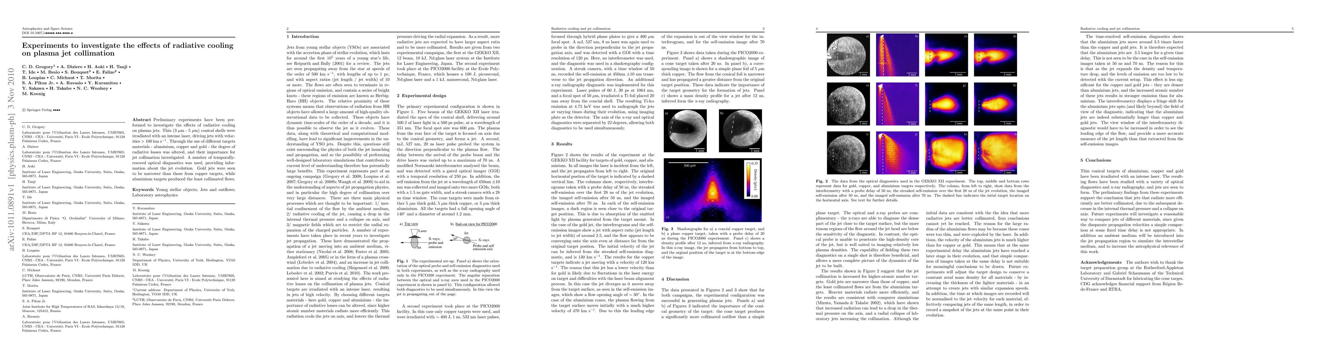 Summary: Experiments using thin conical shells irradiated with a laser to drive plasma jets show that radiative cooling significantly affects jet collimation, with gold producing the most collimated jets and aluminium the least collimated, indicating material-dependent radiative losses impact jet formation.