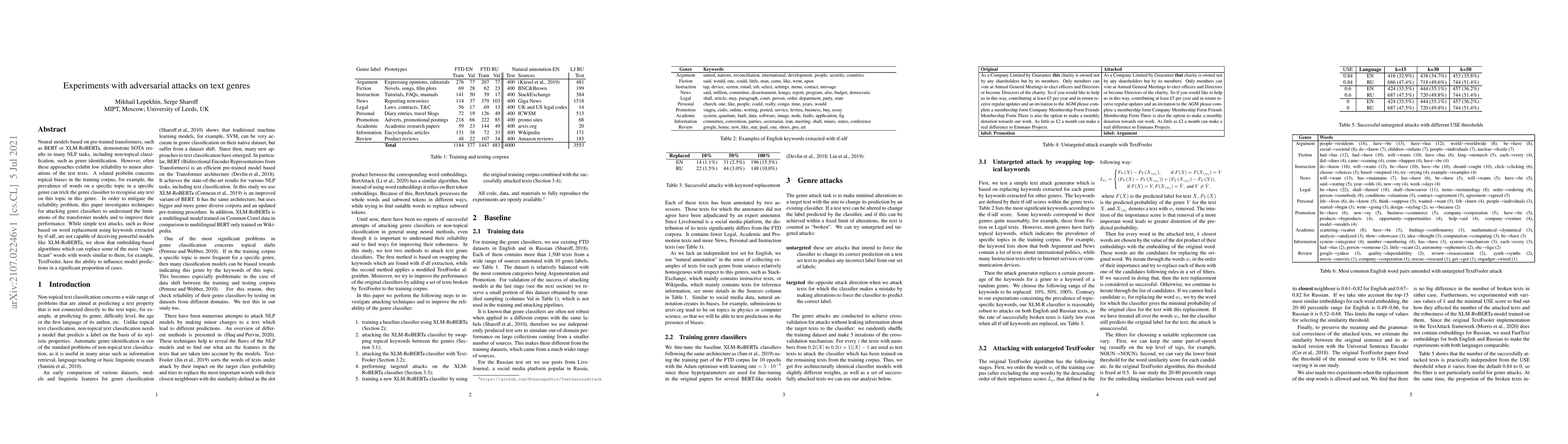 Neural models based on pre-trained transformers, such as BERT or XLM-RoBERTa, demonstrate SOTA results in many NLP tasks, including non-topical classification, such as genre identification. However, often these approaches exhibit low reliability to minor alterations of the test texts. A related probelm concerns topical biases in the training corpus, for example, the prevalence of words on a specific topic in a specific genre can trick the genre classifier to recognise any text on this topic in this genre. In order to mitigate the reliability problem, this paper investigates techniques for attacking genre classifiers to understand the limitations of the transformer models and to improve their performance. While simple text attacks, such as those based on word replacement using keywords extracted by tf-idf, are not capable of deceiving powerful models like XLM-RoBERTa, we show that embedding-based algorithms which can replace some of the most ``significant'' words with words similar to them, for example, TextFooler, have the ability to influence model predictions in a significant proportion of cases.