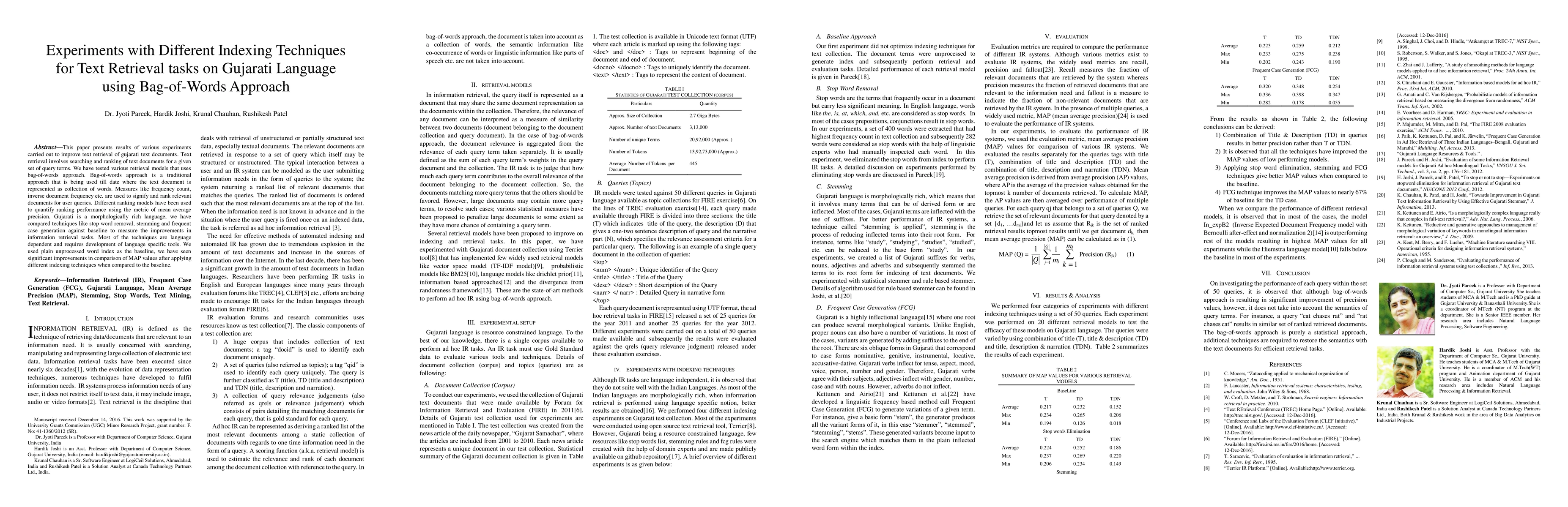 This paper evaluates indexing techniques for text retrieval in Gujarati language, achieving significant improvements over a baseline using bag-of-words approach and metrics like mean average precision.