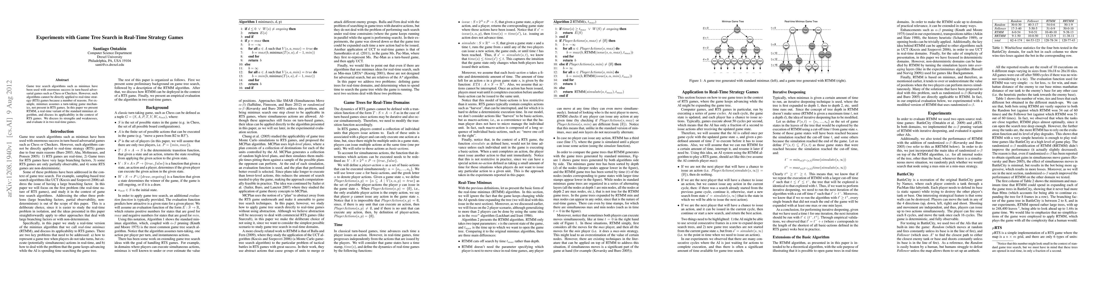 This paper introduces RTMM, a real-time adaptation of the minimax algorithm, designed to address the unique challenges of real-time strategy (RTS) games. The study evaluates RTMM's performance and discusses its strengths and limitations in two RTS games.