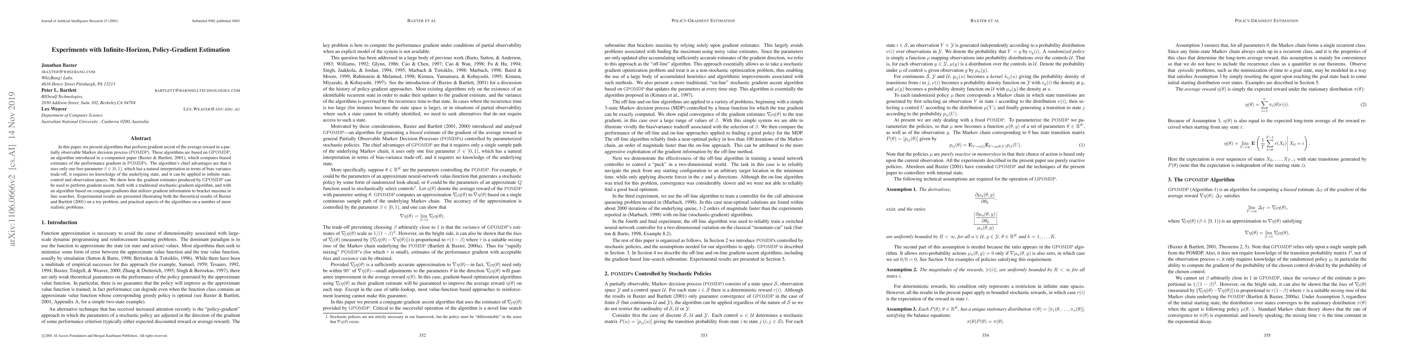 In this paper, we present algorithms that perform gradient ascent of the average reward in a partially observable Markov decision process (POMDP). These algorithms are based on GPOMDP, an algorithm introduced in a companion paper (Baxter and Bartlett, this volume), which computes biased estimates of the performance gradient in POMDPs. The algorithm's chief advantages are that it uses only one free parameter beta, which has a natural interpretation in terms of bias-variance trade-off, it requires no knowledge of the underlying state, and it can be applied to infinite state, control and observation spaces. We show how the gradient estimates produced by GPOMDP can be used to perform gradient ascent, both with a traditional stochastic-gradient algorithm, and with an algorithm based on conjugate-gradients that utilizes gradient information to bracket maxima in line searches. Experimental results are presented illustrating both the theoretical results of (Baxter and Bartlett, this volume) on a toy problem, and practical aspects of the algorithms on a number of more realistic problems.