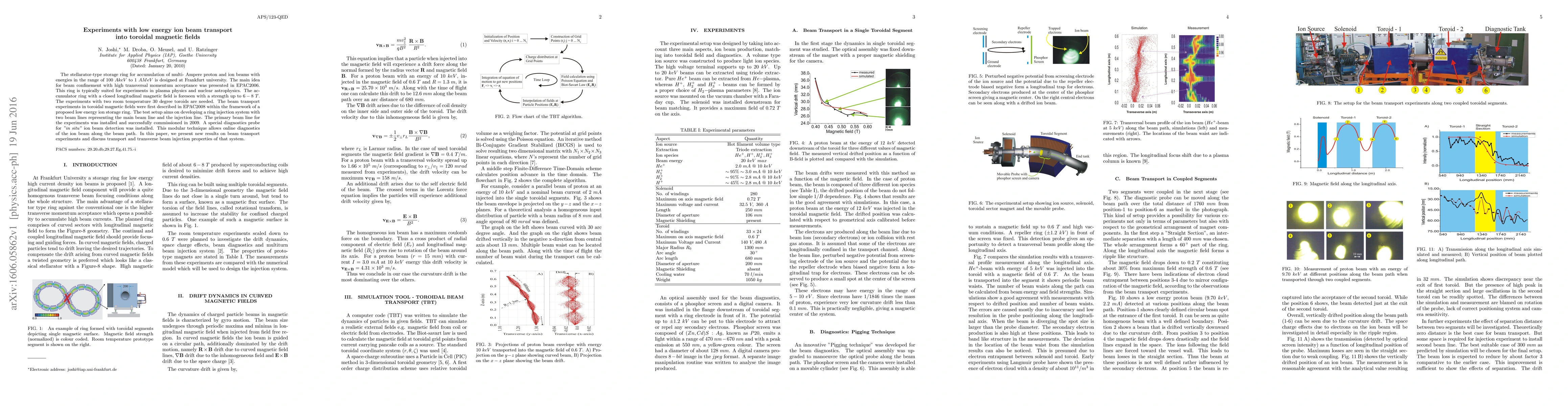 The stellarator-type storage ring for accumulation of multi- Ampere proton and ion beams with energies in the range of $100~AkeV$ to $1~AMeV$ is designed at Frankfurt university. The main idea for beam confinement with high transversal momentum acceptance was presented in EPAC2006. This ring is typically suited for experiments in plasma physics and nuclear astrophysics. The accumulator ring with a closed longitudinal magnetic field is foreseen with a strength up to $6-8~T$. The experiments with two room temperature 30 degree toroids are needed. The beam transport experiments in toroidal magnetic fields were first described in EPAC2008 within the framework of a proposed low energy ion storage ring. The test setup aims on developing a ring injection system with two beam lines representing the main beam line and the injection line. The primary beam line for the experiments was installed and successfully commissioned in 2009. A special diagnostics probe for \textit{"in situ"} ion beam detection was installed.This modular technique allows online diagnostics of the ion beam along the beam path. In this paper, we present new results on beam transport experiments and discuss transport and transverse beam injection properties of that system.