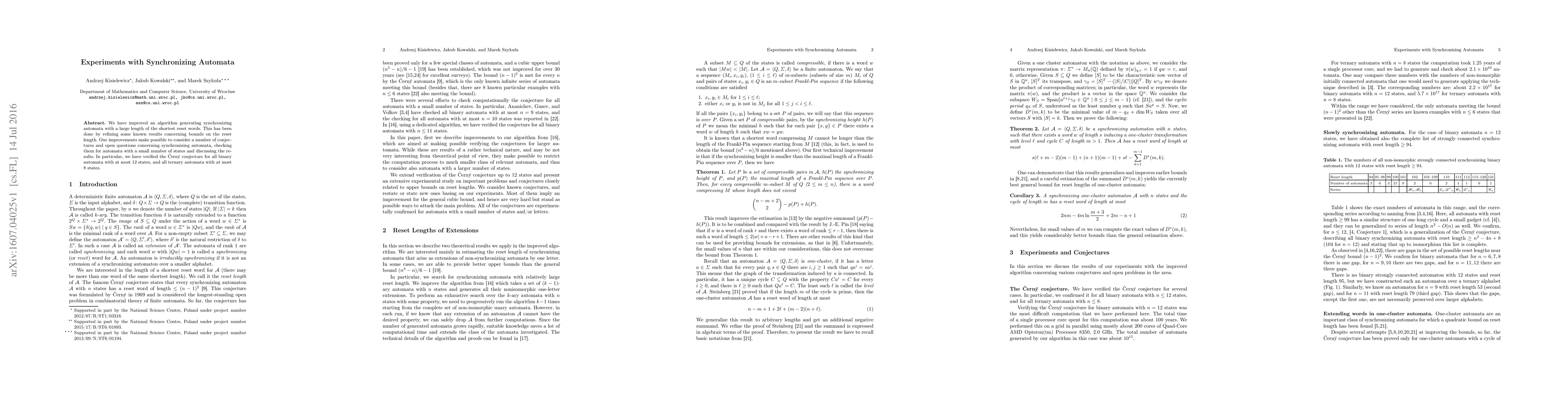 We have improved an algorithm generating synchronizing automata with a large length of the shortest reset words. This has been done by refining some known results concerning bounds on the reset length. Our improvements make possible to consider a number of conjectures and open questions concerning synchronizing automata, checking them for automata with a small number of states and discussing the results. In particular, we have verified the \v{C}ern\'y conjecture for all binary automata with at most 12 states, and all ternary automata with at most 8 states.