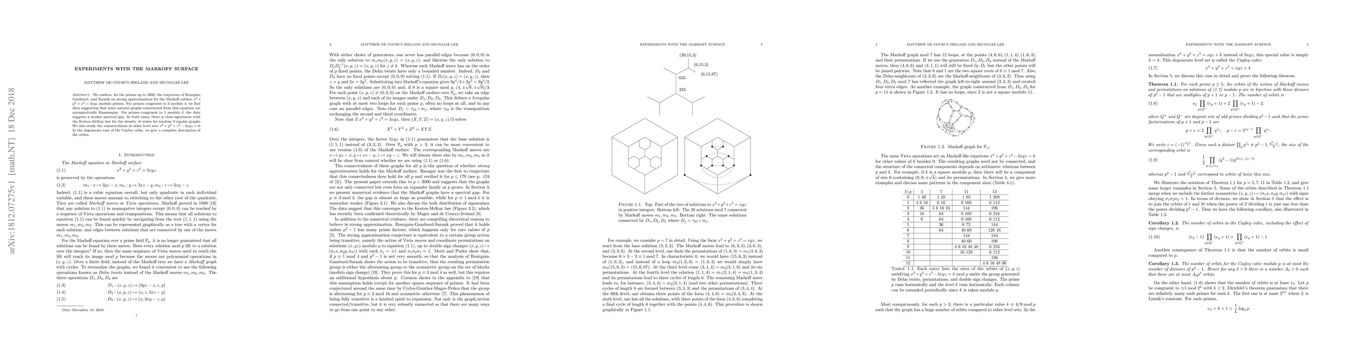 We confirm, for the primes up to 3000, the conjecture of Bourgain, Gamburd, and Sarnak on strong approximation for the Markoff surface $x^2+y^2+z^2 = 3xyz$ modulo primes. For primes congruent to 3 modulo 4, we find data suggesting that some natural graphs constructed from this equation are asymptotically Ramanujan. For primes congruent to 1 modulo 4, the data suggest a weaker spectral gap. In both cases, there is close agreement with the Kesten-McKay law for the density of states for random 3-regular graphs. We also study the connectedness of other level sets $x^2+y^2+z^2-3xyz = k$. In the degenerate case of the Cayley cubic, we give a complete description of the orbits.