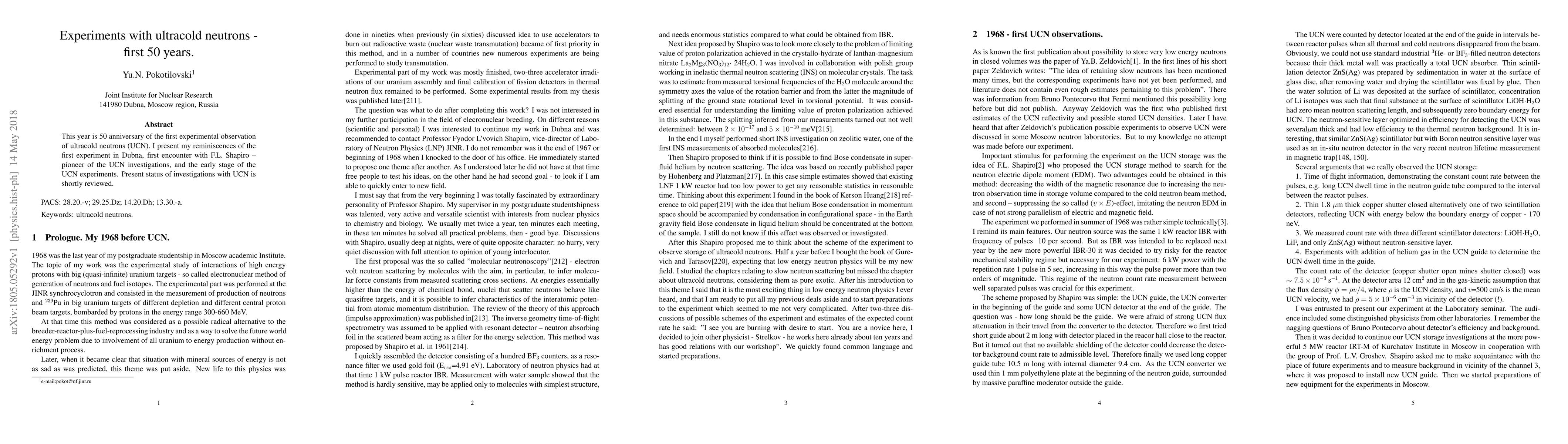 This paper commemorates the 50th anniversary of the first observation of ultracold neutrons (UCN) and recounts the author's recollections from the pioneering experiment in Dubna, including interactions with UCN pioneer F.L. Shapiro, followed by a brief review of current UCN research status.