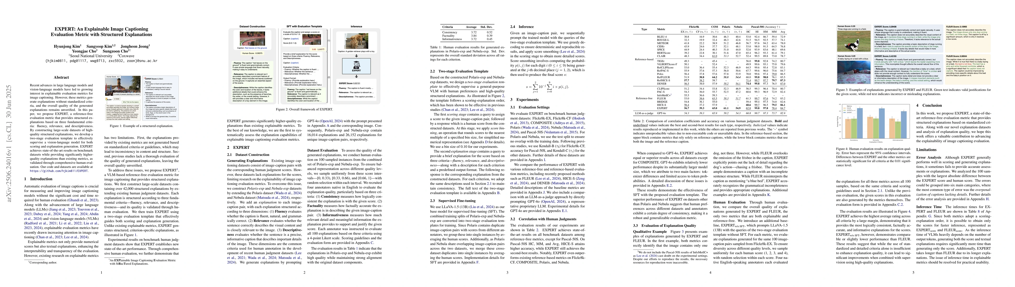 Recent advances in large language models and vision-language models have led to growing interest in explainable evaluation metrics for image captioning. However, these metrics generate explanations without standardized criteria, and the overall quality of the generated explanations remains unverified. In this paper, we propose EXPERT, a reference-free evaluation metric that provides structured explanations based on three fundamental criteria: fluency, relevance, and descriptiveness. By constructing large-scale datasets of high-quality structured explanations, we develop a two-stage evaluation template to effectively supervise a vision-language model for both scoring and explanation generation. EXPERT achieves state-of-the-art results on benchmark datasets while providing significantly higher-quality explanations than existing metrics, as validated through comprehensive human evaluation. Our code and datasets are available at https://github.com/hjkim811/EXPERT.