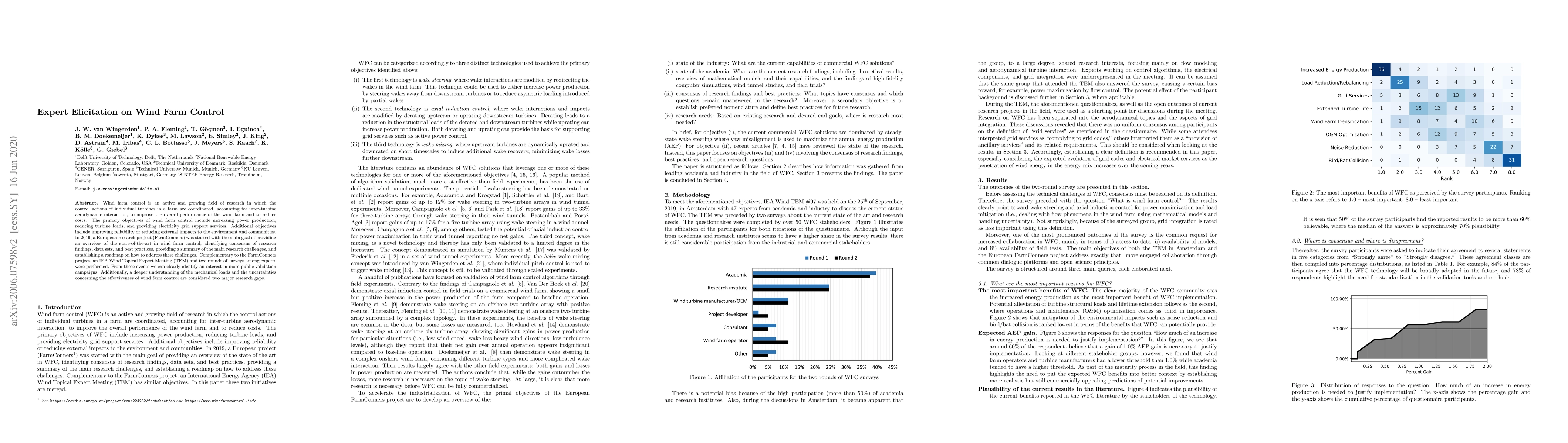 This research paper summarizes expert elicitation on wind farm control, focusing on coordinated control actions to enhance performance and reduce costs. Key objectives include increased power production, reduced turbine loads, and grid support, with identified research gaps in mechanical load understanding and validation campaigns.