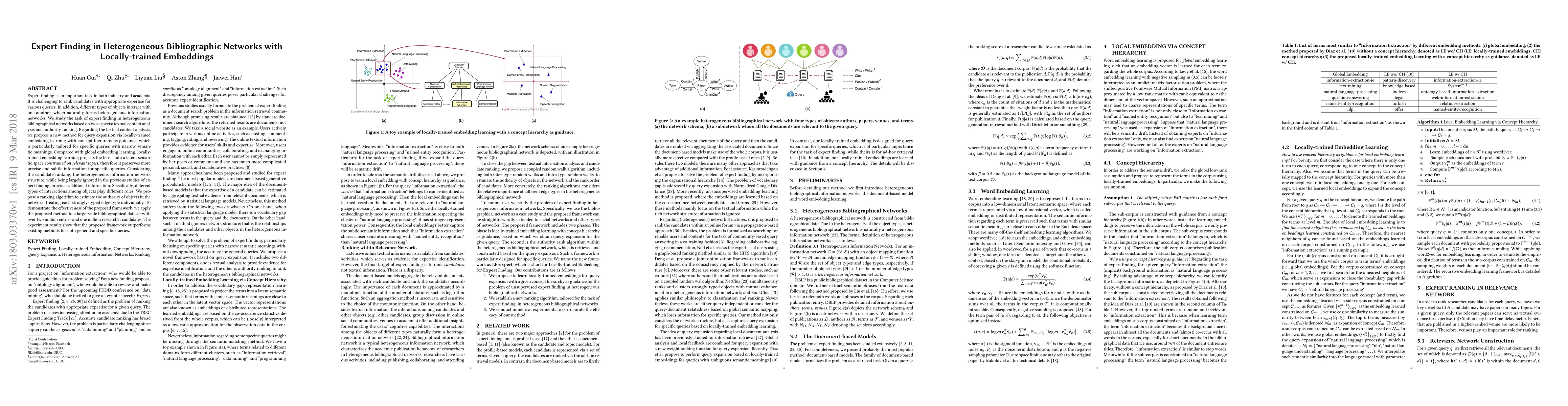 Expert finding is an important task in both industry and academia. It is challenging to rank candidates with appropriate expertise for various queries. In addition, different types of objects interact with one another, which naturally forms heterogeneous information networks. We study the task of expert finding in heterogeneous bibliographical networks based on two aspects: textual content analysis and authority ranking. Regarding the textual content analysis, we propose a new method for query expansion via locally-trained embedding learning with concept hierarchy as guidance, which is particularly tailored for specific queries with narrow semantic meanings. Compared with global embedding learning, locally-trained embedding learning projects the terms into a latent semantic space constrained on relevant topics, therefore it preserves more precise and subtle information for specific queries. Considering the candidate ranking, the heterogeneous information network structure, while being largely ignored in the previous studies of expert finding, provides additional information. Specifically, different types of interactions among objects play different roles. We propose a ranking algorithm to estimate the authority of objects in the network, treating each strongly-typed edge type individually. To demonstrate the effectiveness of the proposed framework, we apply the proposed method to a large-scale bibliographical dataset with over two million entries and one million researcher candidates. The experiment results show that the proposed framework outperforms existing methods for both general and specific queries.