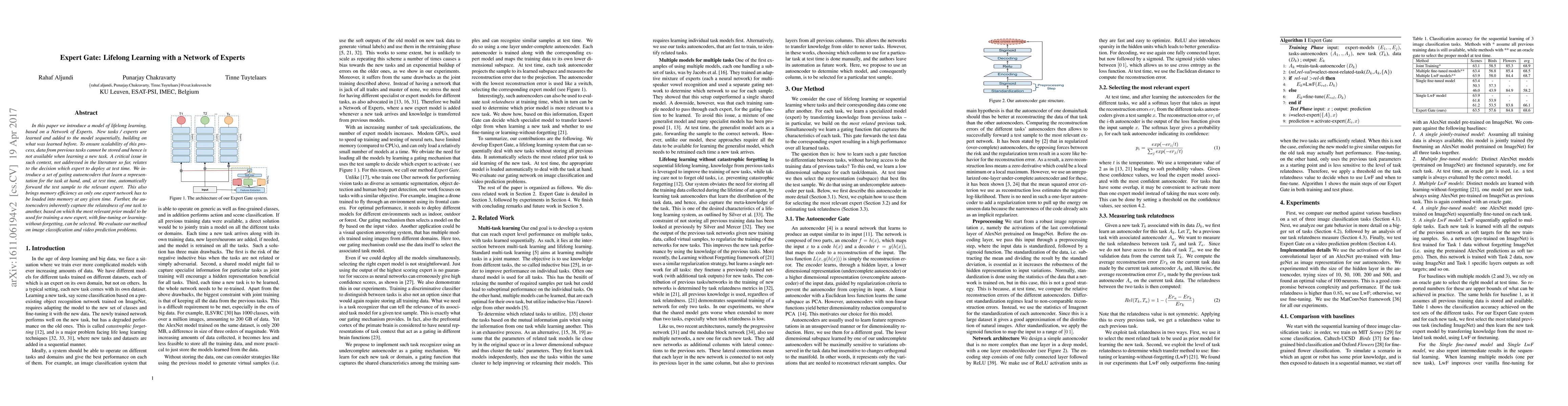 In this paper we introduce a model of lifelong learning, based on a Network of Experts. New tasks / experts are learned and added to the model sequentially, building on what was learned before. To ensure scalability of this process,data from previous tasks cannot be stored and hence is not available when learning a new task. A critical issue in such context, not addressed in the literature so far, relates to the decision which expert to deploy at test time. We introduce a set of gating autoencoders that learn a representation for the task at hand, and, at test time, automatically forward the test sample to the relevant expert. This also brings memory efficiency as only one expert network has to be loaded into memory at any given time. Further, the autoencoders inherently capture the relatedness of one task to another, based on which the most relevant prior model to be used for training a new expert, with finetuning or learning without-forgetting, can be selected. We evaluate our method on image classification and video prediction problems.