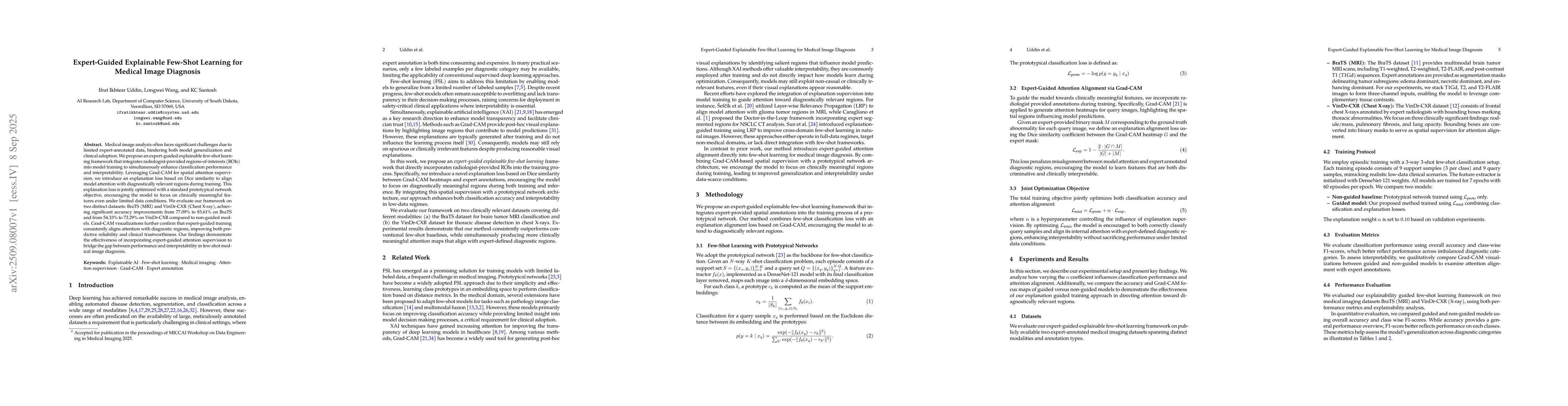 Medical image analysis often faces significant challenges due to limited expert-annotated data, hindering both model generalization and clinical adoption. We propose an expert-guided explainable few-shot learning framework that integrates radiologist-provided regions of interest (ROIs) into model training to simultaneously enhance classification performance and interpretability. Leveraging Grad-CAM for spatial attention supervision, we introduce an explanation loss based on Dice similarity to align model attention with diagnostically relevant regions during training. This explanation loss is jointly optimized with a standard prototypical network objective, encouraging the model to focus on clinically meaningful features even under limited data conditions. We evaluate our framework on two distinct datasets: BraTS (MRI) and VinDr-CXR (Chest X-ray), achieving significant accuracy improvements from 77.09% to 83.61% on BraTS and from 54.33% to 73.29% on VinDr-CXR compared to non-guided models. Grad-CAM visualizations further confirm that expert-guided training consistently aligns attention with diagnostic regions, improving both predictive reliability and clinical trustworthiness. Our findings demonstrate the effectiveness of incorporating expert-guided attention supervision to bridge the gap between performance and interpretability in few-shot medical image diagnosis.