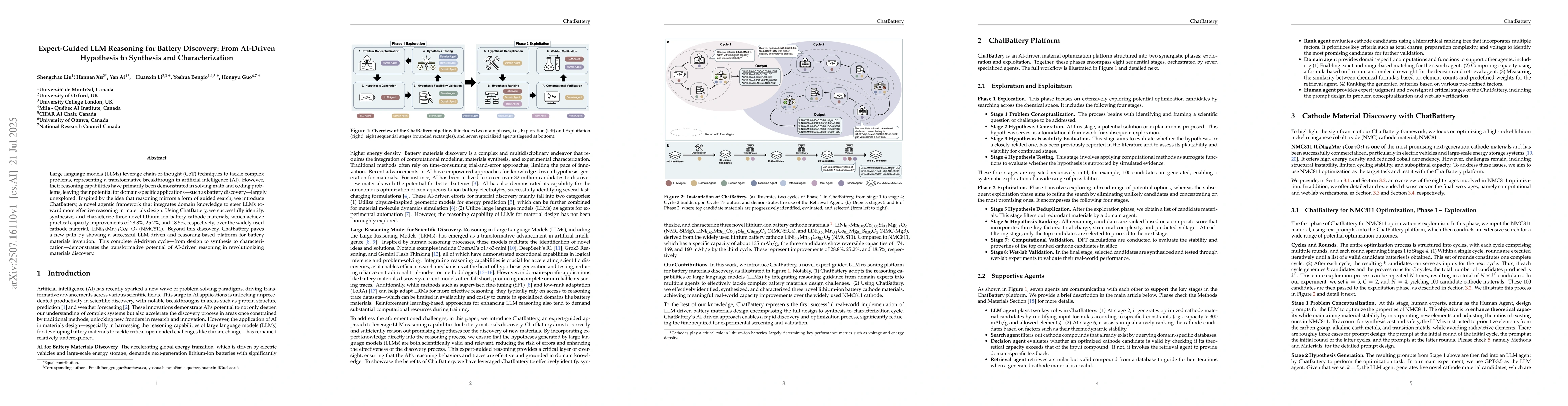 Large language models (LLMs) leverage chain-of-thought (CoT) techniques to tackle complex problems, representing a transformative breakthrough in artificial intelligence (AI). However, their reasoning capabilities have primarily been demonstrated in solving math and coding problems, leaving their potential for domain-specific applications-such as battery discovery-largely unexplored. Inspired by the idea that reasoning mirrors a form of guided search, we introduce ChatBattery, a novel agentic framework that integrates domain knowledge to steer LLMs toward more effective reasoning in materials design. Using ChatBattery, we successfully identify, synthesize, and characterize three novel lithium-ion battery cathode materials, which achieve practical capacity improvements of 28.8%, 25.2%, and 18.5%, respectively, over the widely used cathode material, LiNi0.8Mn0.1Co0.1O2 (NMC811). Beyond this discovery, ChatBattery paves a new path by showing a successful LLM-driven and reasoning-based platform for battery materials invention. This complete AI-driven cycle-from design to synthesis to characterization-demonstrates the transformative potential of AI-driven reasoning in revolutionizing materials discovery.
