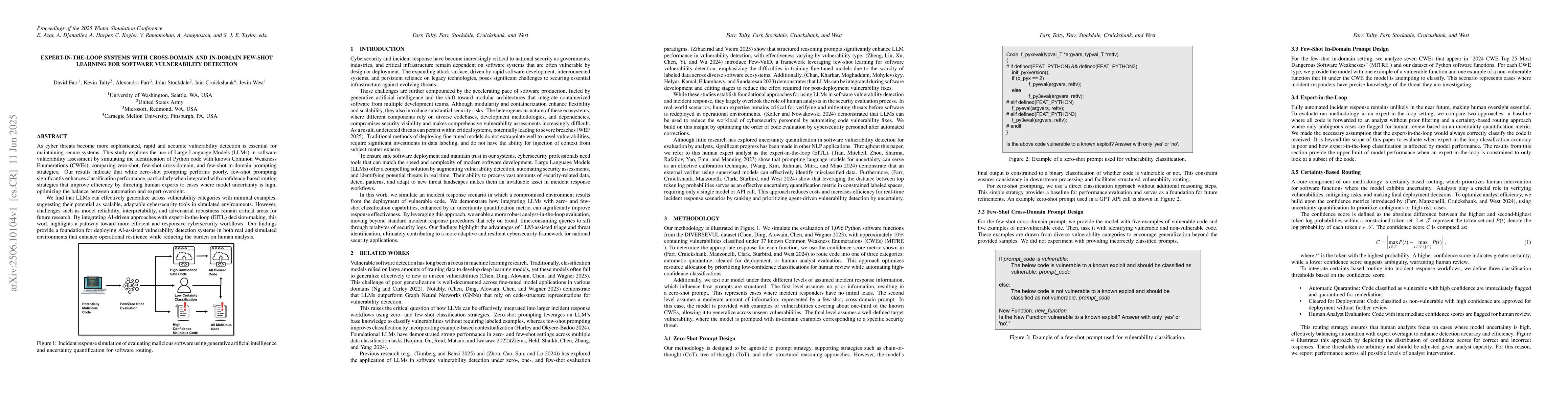 As cyber threats become more sophisticated, rapid and accurate vulnerability detection is essential for maintaining secure systems. This study explores the use of Large Language Models (LLMs) in software vulnerability assessment by simulating the identification of Python code with known Common Weakness Enumerations (CWEs), comparing zero-shot, few-shot cross-domain, and few-shot in-domain prompting strategies. Our results indicate that while zero-shot prompting performs poorly, few-shot prompting significantly enhances classification performance, particularly when integrated with confidence-based routing strategies that improve efficiency by directing human experts to cases where model uncertainty is high, optimizing the balance between automation and expert oversight. We find that LLMs can effectively generalize across vulnerability categories with minimal examples, suggesting their potential as scalable, adaptable cybersecurity tools in simulated environments. However, challenges such as model reliability, interpretability, and adversarial robustness remain critical areas for future research. By integrating AI-driven approaches with expert-in-the-loop (EITL) decision-making, this work highlights a pathway toward more efficient and responsive cybersecurity workflows. Our findings provide a foundation for deploying AI-assisted vulnerability detection systems in both real and simulated environments that enhance operational resilience while reducing the burden on human analysts.