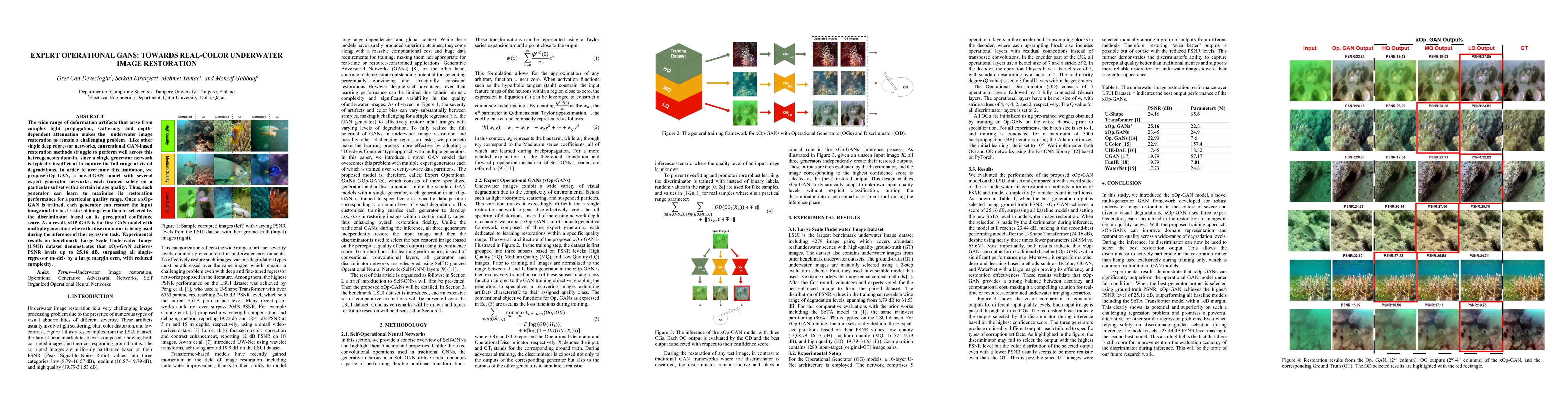 The research introduces xOp-GAN, a Generative Adversarial Network (GAN) model with multiple expert generator networks, each specialized in restoring images of specific quality ranges. This approach surpasses single-regressor models in underwater image restoration, achieving higher PSNR levels with reduced complexity, as demonstrated on the Large Scale Underwater Image dataset.