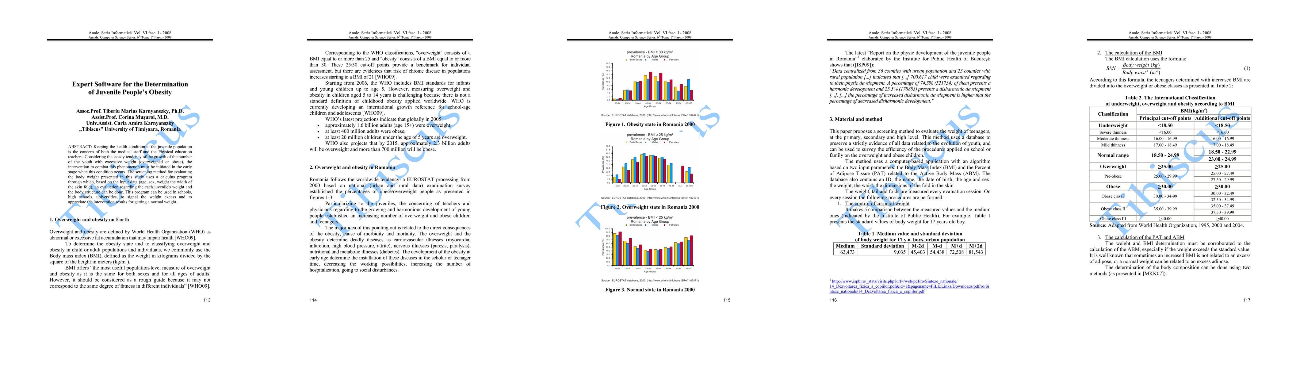 Keeping the health condition at the juvenile population is the concern of both the medical staff and the physical education teachers. Considering the steady tendency of the growth of the number of the youth with excessive weight (overweighted or obese) the intervention to combat this phenomenon must be initiated in the early stage when this condition occurs. The screening method for evaluating the body weight presented in this study uses a calculus program through which, based on the input data (age, sex, weight the width of the skin fold) an evaluation regarding each juvenile's weight and the body structure can be done. This program can be used in schools, high schools, universities, to signal the weight excess and to appreciate the intervention results for getting a normal weight.