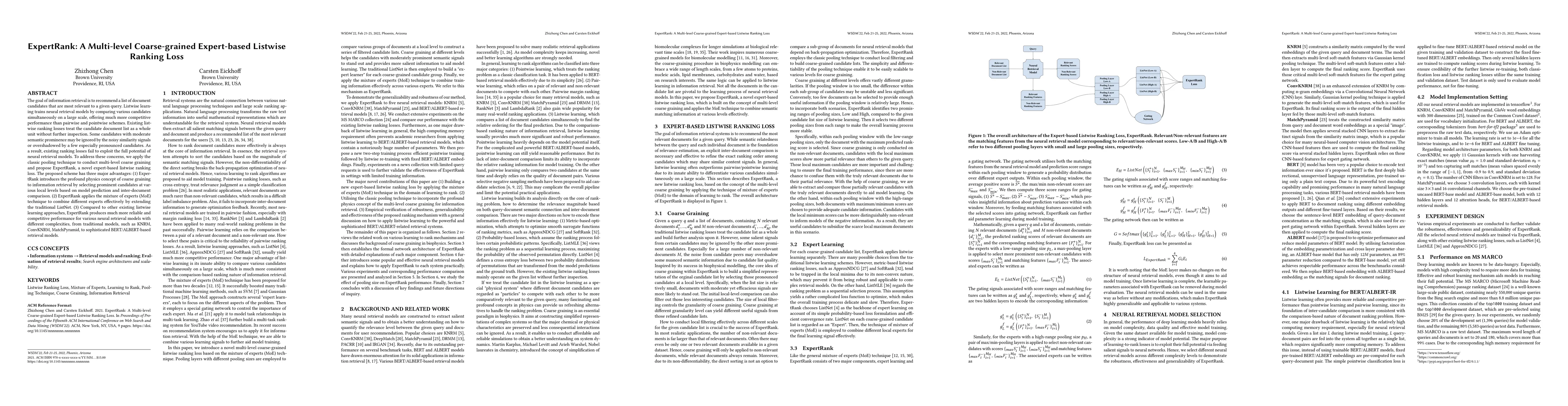 ExpertRank introduces a multi-level coarse-grained expert-based listwise ranking loss to enhance neural retrieval models by selecting prominent candidates at various local levels and combining experts effectively using the mixture of experts technique. It outperforms existing listwise ranking losses by producing more reliable and competitive performance across different neural retrieval models.