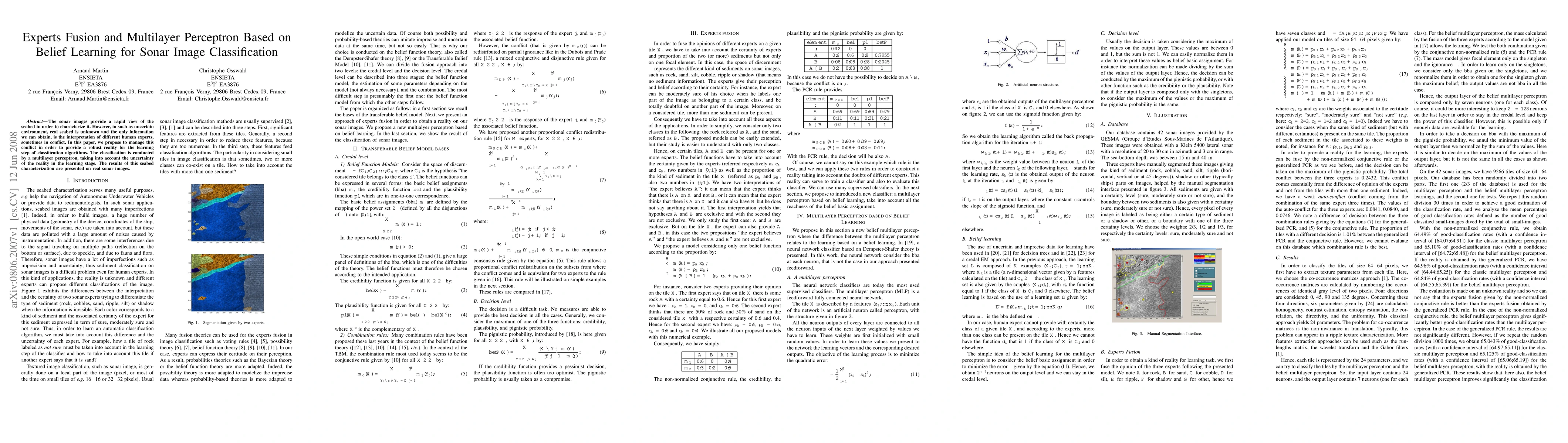 The sonar images provide a rapid view of the seabed in order to characterize it. However, in such as uncertain environment, real seabed is unknown and the only information we can obtain, is the interpretation of different human experts, sometimes in conflict. In this paper, we propose to manage this conflict in order to provide a robust reality for the learning step of classification algorithms. The classification is conducted by a multilayer perceptron, taking into account the uncertainty of the reality in the learning stage. The results of this seabed characterization are presented on real sonar images.