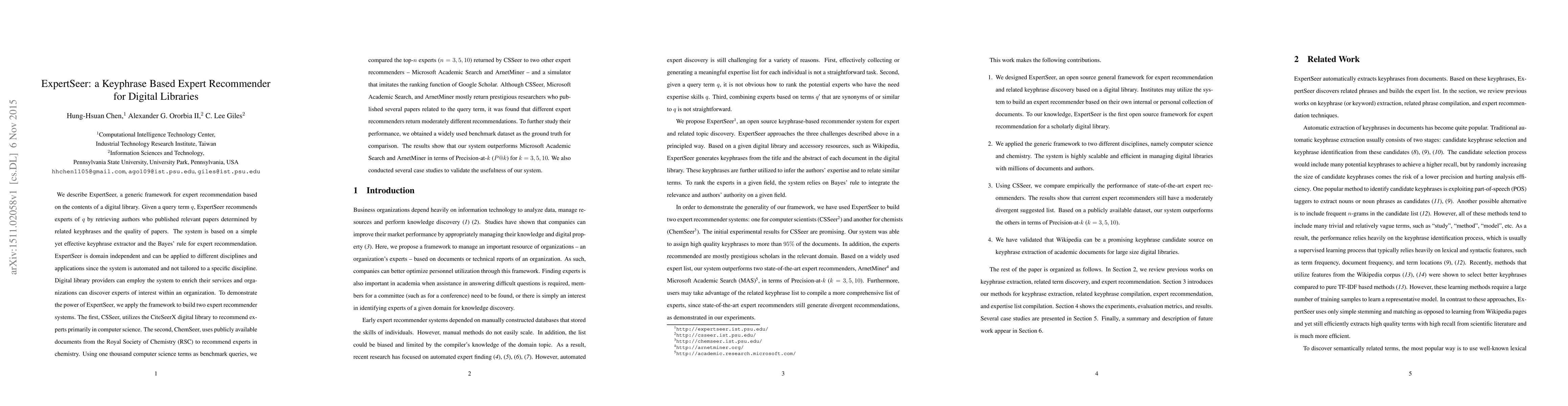 ExpertSeer is a system that recommends experts based on keyphrases and paper quality in digital libraries, outperforming other expert recommenders in terms of precision for specific domains.