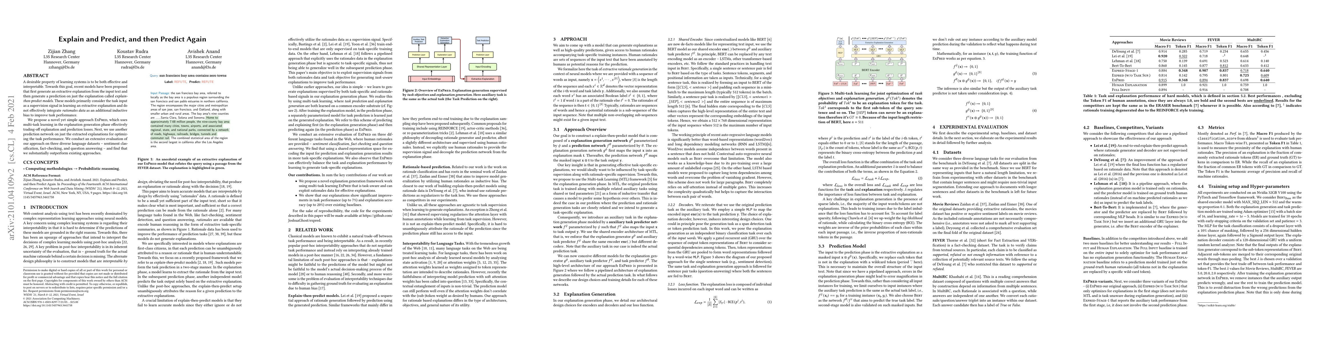 A desirable property of learning systems is to be both effective and interpretable. Towards this goal, recent models have been proposed that first generate an extractive explanation from the input text and then generate a prediction on just the explanation called explain-then-predict models. These models primarily consider the task input as a supervision signal in learning an extractive explanation and do not effectively integrate rationales data as an additional inductive bias to improve task performance. We propose a novel yet simple approach ExPred, that uses multi-task learning in the explanation generation phase effectively trading-off explanation and prediction losses. And then we use another prediction network on just the extracted explanations for optimizing the task performance. We conduct an extensive evaluation of our approach on three diverse language datasets -- fact verification, sentiment classification, and QA -- and find that we substantially outperform existing approaches.