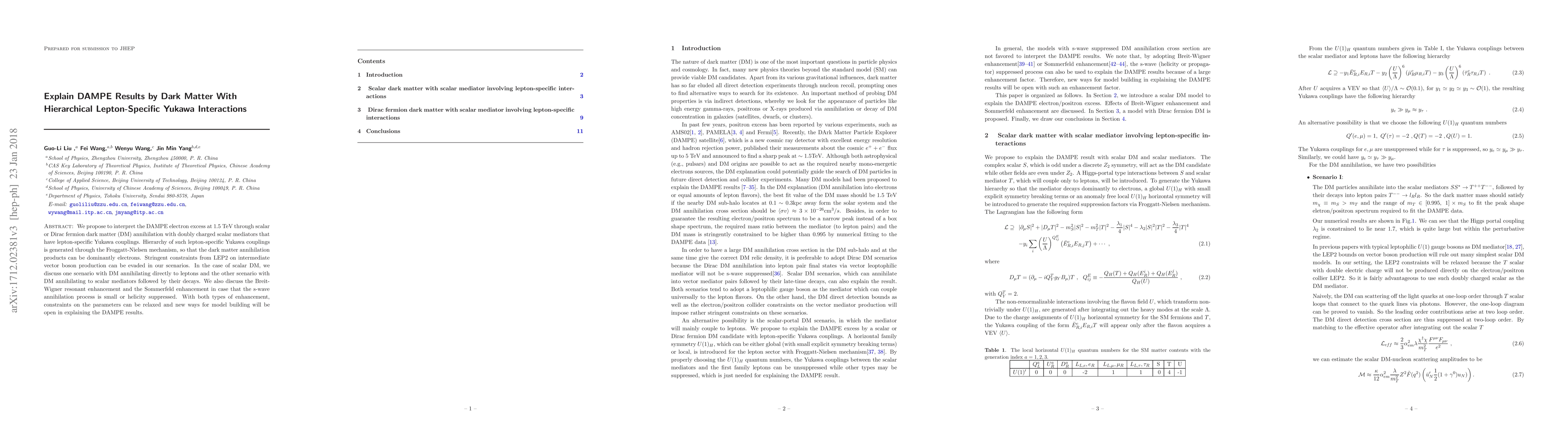 The DAMPE electron excess at 1.5 TeV is interpreted via scalar or Dirac fermion dark matter annihilation through doubly charged scalar mediators with lepton-specific Yukawa interactions. The hierarchical Yukawa coupling hierarchy is generated via the Froggatt-Nielsen mechanism, allowing dominant electron annihilation products.