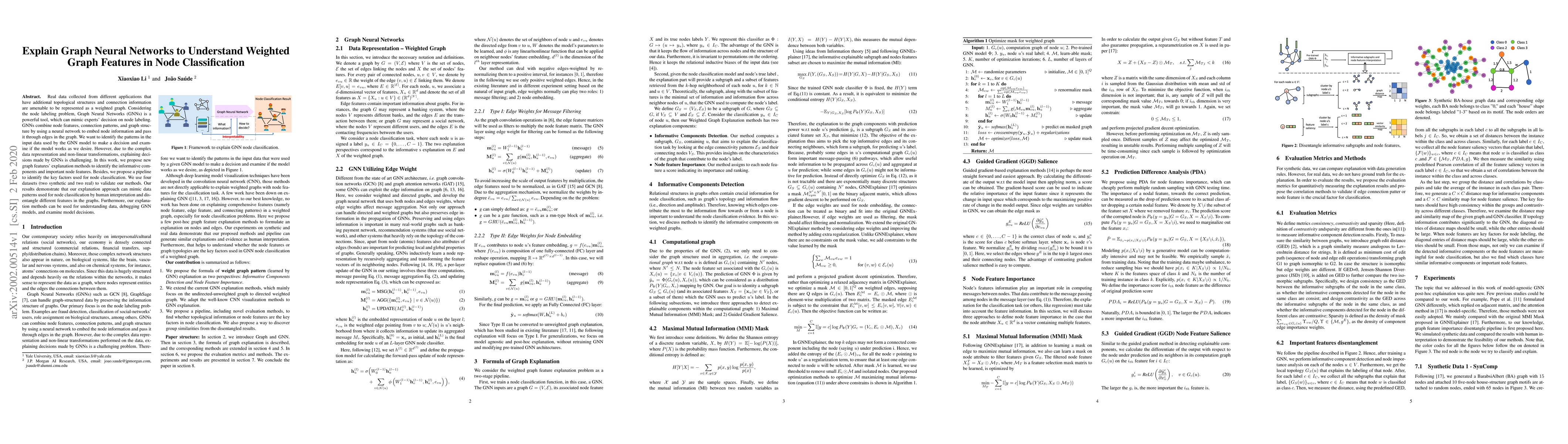 Real data collected from different applications that have additional topological structures and connection information are amenable to be represented as a weighted graph. Considering the node labeling problem, Graph Neural Networks (GNNs) is a powerful tool, which can mimic experts' decision on node labeling. GNNs combine node features, connection patterns, and graph structure by using a neural network to embed node information and pass it through edges in the graph. We want to identify the patterns in the input data used by the GNN model to make a decision and examine if the model works as we desire. However, due to the complex data representation and non-linear transformations, explaining decisions made by GNNs is challenging. In this work, we propose new graph features' explanation methods to identify the informative components and important node features. Besides, we propose a pipeline to identify the key factors used for node classification. We use four datasets (two synthetic and two real) to validate our methods. Our results demonstrate that our explanation approach can mimic data patterns used for node classification by human interpretation and disentangle different features in the graphs. Furthermore, our explanation methods can be used for understanding data, debugging GNN models, and examine model decisions.