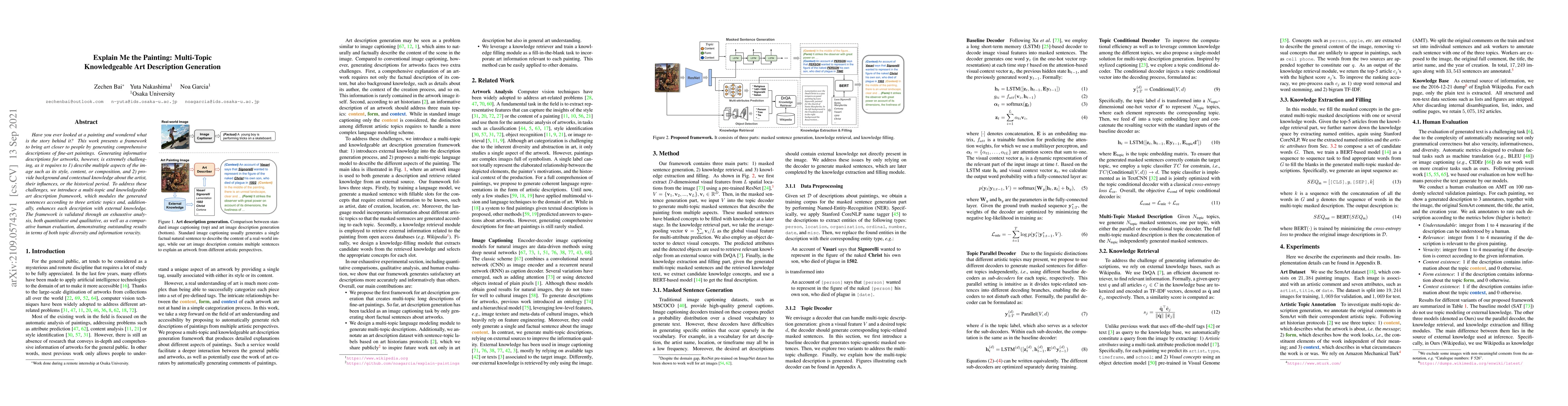 Have you ever looked at a painting and wondered what is the story behind it? This work presents a framework to bring art closer to people by generating comprehensive descriptions of fine-art paintings. Generating informative descriptions for artworks, however, is extremely challenging, as it requires to 1) describe multiple aspects of the image such as its style, content, or composition, and 2) provide background and contextual knowledge about the artist, their influences, or the historical period. To address these challenges, we introduce a multi-topic and knowledgeable art description framework, which modules the generated sentences according to three artistic topics and, additionally, enhances each description with external knowledge. The framework is validated through an exhaustive analysis, both quantitative and qualitative, as well as a comparative human evaluation, demonstrating outstanding results in terms of both topic diversity and information veracity.