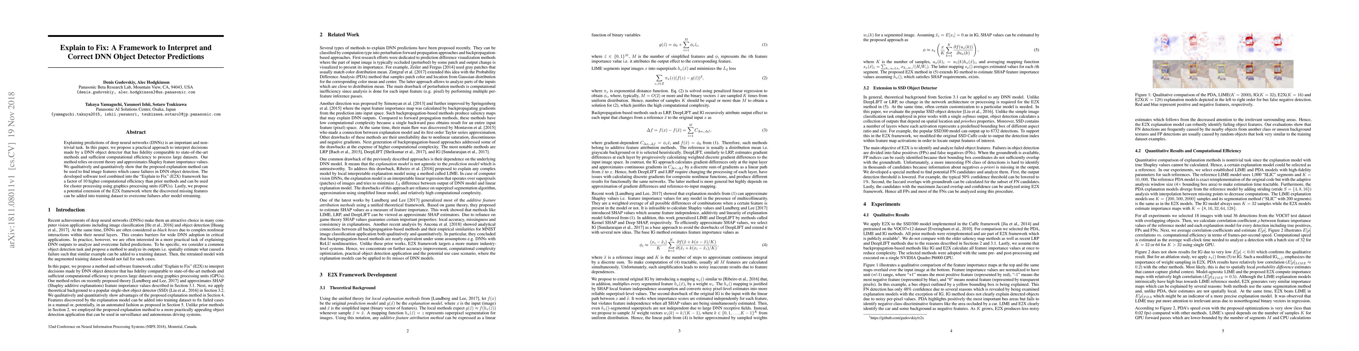 Explaining predictions of deep neural networks (DNNs) is an important and nontrivial task. In this paper, we propose a practical approach to interpret decisions made by a DNN object detector that has fidelity comparable to state-of-the-art methods and sufficient computational efficiency to process large datasets. Our method relies on recent theory and approximates Shapley feature importance values. We qualitatively and quantitatively show that the proposed explanation method can be used to find image features which cause failures in DNN object detection. The developed software tool combined into the "Explain to Fix" (E2X) framework has a factor of 10 higher computational efficiency than prior methods and can be used for cluster processing using graphics processing units (GPUs). Lastly, we propose a potential extension of the E2X framework where the discovered missing features can be added into training dataset to overcome failures after model retraining.