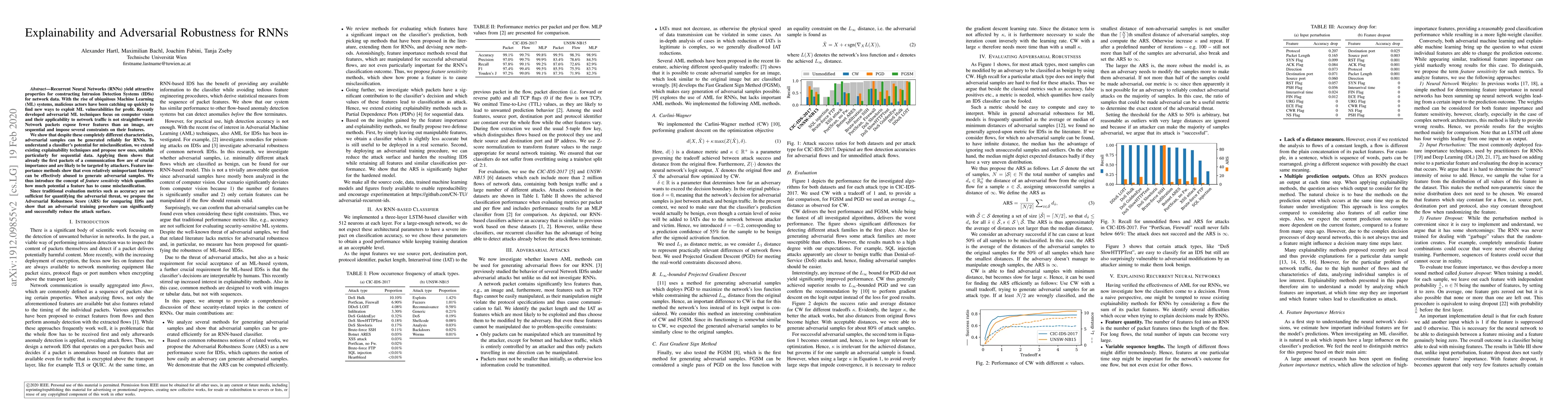 Recurrent Neural Networks (RNNs) yield attractive properties for constructing Intrusion Detection Systems (IDSs) for network data. With the rise of ubiquitous Machine Learning (ML) systems, malicious actors have been catching up quickly to find new ways to exploit ML vulnerabilities for profit. Recently developed adversarial ML techniques focus on computer vision and their applicability to network traffic is not straightforward: Network packets expose fewer features than an image, are sequential and impose several constraints on their features. We show that despite these completely different characteristics, adversarial samples can be generated reliably for RNNs. To understand a classifier's potential for misclassification, we extend existing explainability techniques and propose new ones, suitable particularly for sequential data. Applying them shows that already the first packets of a communication flow are of crucial importance and are likely to be targeted by attackers. Feature importance methods show that even relatively unimportant features can be effectively abused to generate adversarial samples. Since traditional evaluation metrics such as accuracy are not sufficient for quantifying the adversarial threat, we propose the Adversarial Robustness Score (ARS) for comparing IDSs, capturing a common notion of adversarial robustness, and show that an adversarial training procedure can significantly and successfully reduce the attack surface.