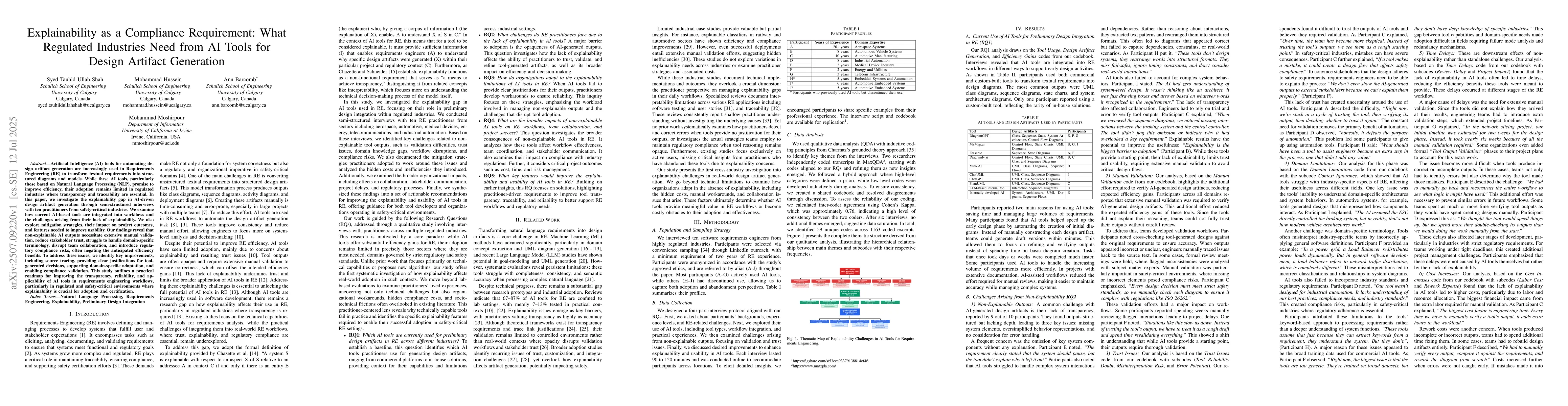 Artificial Intelligence (AI) tools for automating design artifact generation are increasingly used in Requirements Engineering (RE) to transform textual requirements into structured diagrams and models. While these AI tools, particularly those based on Natural Language Processing (NLP), promise to improve efficiency, their adoption remains limited in regulated industries where transparency and traceability are essential. In this paper, we investigate the explainability gap in AI-driven design artifact generation through semi-structured interviews with ten practitioners from safety-critical industries. We examine how current AI-based tools are integrated into workflows and the challenges arising from their lack of explainability. We also explore mitigation strategies, their impact on project outcomes, and features needed to improve usability. Our findings reveal that non-explainable AI outputs necessitate extensive manual validation, reduce stakeholder trust, struggle to handle domain-specific terminology, disrupt team collaboration, and introduce regulatory compliance risks, often negating the anticipated efficiency benefits. To address these issues, we identify key improvements, including source tracing, providing clear justifications for tool-generated decisions, supporting domain-specific adaptation, and enabling compliance validation. This study outlines a practical roadmap for improving the transparency, reliability, and applicability of AI tools in requirements engineering workflows, particularly in regulated and safety-critical environments where explainability is crucial for adoption and certification.