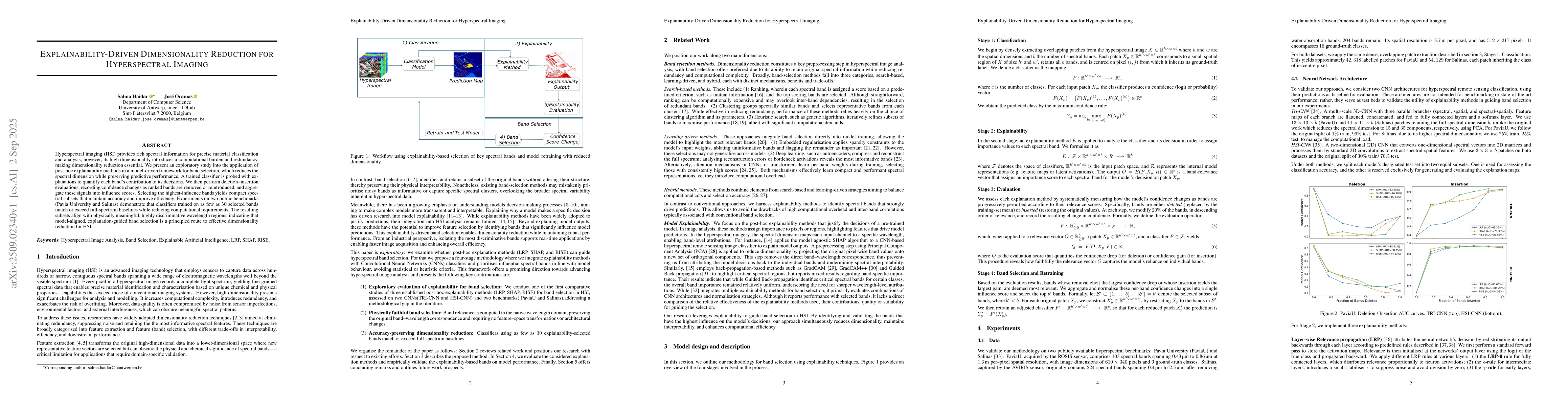 Hyperspectral imaging (HSI) provides rich spectral information for precise material classification and analysis; however, its high dimensionality introduces a computational burden and redundancy, making dimensionality reduction essential. We present an exploratory study into the application of post-hoc explainability methods in a model--driven framework for band selection, which reduces the spectral dimension while preserving predictive performance. A trained classifier is probed with explanations to quantify each band's contribution to its decisions. We then perform deletion--insertion evaluations, recording confidence changes as ranked bands are removed or reintroduced, and aggregate these signals into influence scores. Selecting the highest--influence bands yields compact spectral subsets that maintain accuracy and improve efficiency. Experiments on two public benchmarks (Pavia University and Salinas) demonstrate that classifiers trained on as few as 30 selected bands match or exceed full--spectrum baselines while reducing computational requirements. The resulting subsets align with physically meaningful, highly discriminative wavelength regions, indicating that model--aligned, explanation-guided band selection is a principled route to effective dimensionality reduction for HSI.