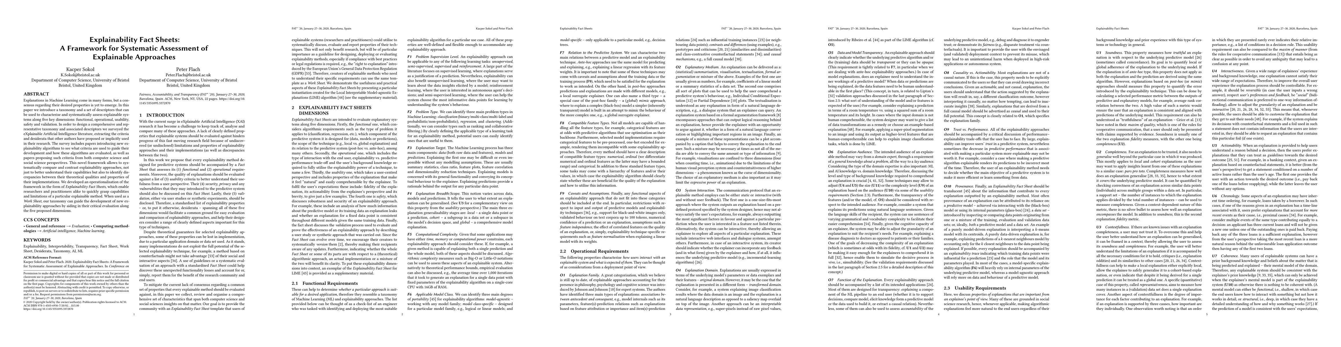 Explanations in Machine Learning come in many forms, but a consensus regarding their desired properties is yet to emerge. In this paper we introduce a taxonomy and a set of descriptors that can be used to characterise and systematically assess explainable systems along five key dimensions: functional, operational, usability, safety and validation. In order to design a comprehensive and representative taxonomy and associated descriptors we surveyed the eXplainable Artificial Intelligence literature, extracting the criteria and desiderata that other authors have proposed or implicitly used in their research. The survey includes papers introducing new explainability algorithms to see what criteria are used to guide their development and how these algorithms are evaluated, as well as papers proposing such criteria from both computer science and social science perspectives. This novel framework allows to systematically compare and contrast explainability approaches, not just to better understand their capabilities but also to identify discrepancies between their theoretical qualities and properties of their implementations. We developed an operationalisation of the framework in the form of Explainability Fact Sheets, which enable researchers and practitioners alike to quickly grasp capabilities and limitations of a particular explainable method. When used as a Work Sheet, our taxonomy can guide the development of new explainability approaches by aiding in their critical evaluation along the five proposed dimensions.