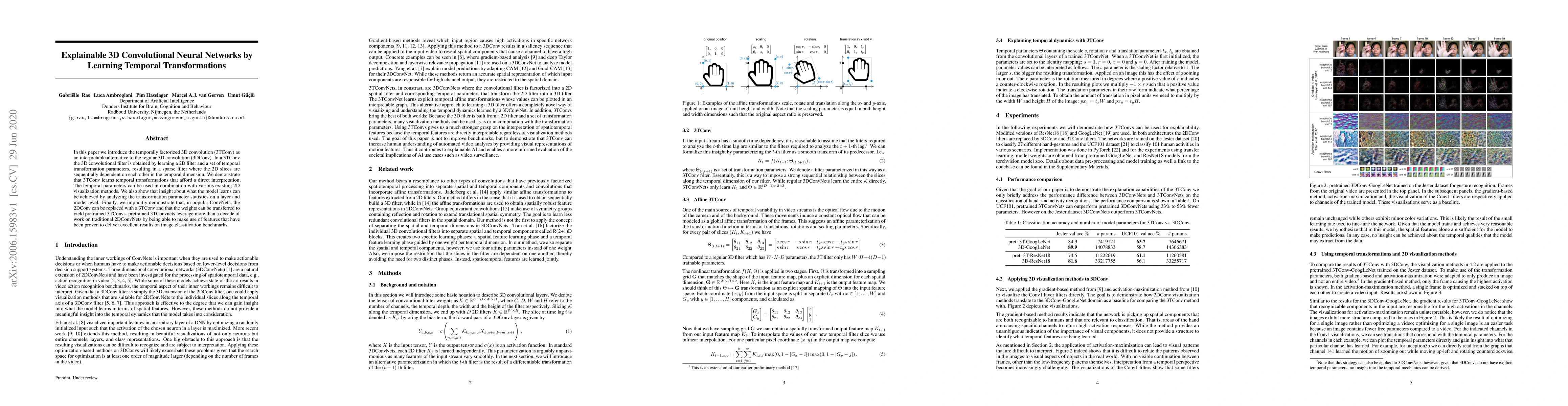 In this paper we introduce the temporally factorized 3D convolution (3TConv) as an interpretable alternative to the regular 3D convolution (3DConv). In a 3TConv the 3D convolutional filter is obtained by learning a 2D filter and a set of temporal transformation parameters, resulting in a sparse filter where the 2D slices are sequentially dependent on each other in the temporal dimension. We demonstrate that 3TConv learns temporal transformations that afford a direct interpretation. The temporal parameters can be used in combination with various existing 2D visualization methods. We also show that insight about what the model learns can be achieved by analyzing the transformation parameter statistics on a layer and model level. Finally, we implicitly demonstrate that, in popular ConvNets, the 2DConv can be replaced with a 3TConv and that the weights can be transferred to yield pretrained 3TConvs. pretrained 3TConvnets leverage more than a decade of work on traditional 2DConvNets by being able to make use of features that have been proven to deliver excellent results on image classification benchmarks.