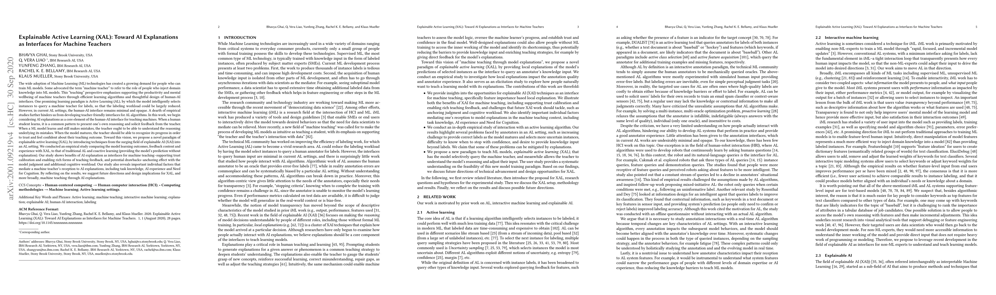 The wide adoption of Machine Learning technologies has created a rapidly growing demand for people who can train ML models. Some advocated the term "machine teacher" to refer to the role of people who inject domain knowledge into ML models. One promising learning paradigm is Active Learning (AL), by which the model intelligently selects instances to query the machine teacher for labels. However, in current AL settings, the human-AI interface remains minimal and opaque. We begin considering AI explanations as a core element of the human-AI interface for teaching machines. When a human student learns, it is a common pattern to present one's own reasoning and solicit feedback from the teacher. When a ML model learns and still makes mistakes, the human teacher should be able to understand the reasoning underlying the mistakes. When the model matures, the machine teacher should be able to recognize its progress in order to trust and feel confident about their teaching outcome. Toward this vision, we propose a novel paradigm of explainable active learning (XAL), by introducing techniques from the recently surging field of explainable AI (XAI) into an AL setting. We conducted an empirical study comparing the model learning outcomes, feedback content and experience with XAL, to that of traditional AL and coactive learning (providing the model's prediction without the explanation). Our study shows benefits of AI explanation as interfaces for machine teaching--supporting trust calibration and enabling rich forms of teaching feedback, and potential drawbacks--anchoring effect with the model judgment and cognitive workload. Our study also reveals important individual factors that mediate a machine teacher's reception to AI explanations, including task knowledge, AI experience and need for cognition. By reflecting on the results, we suggest future directions and design implications for XAL.