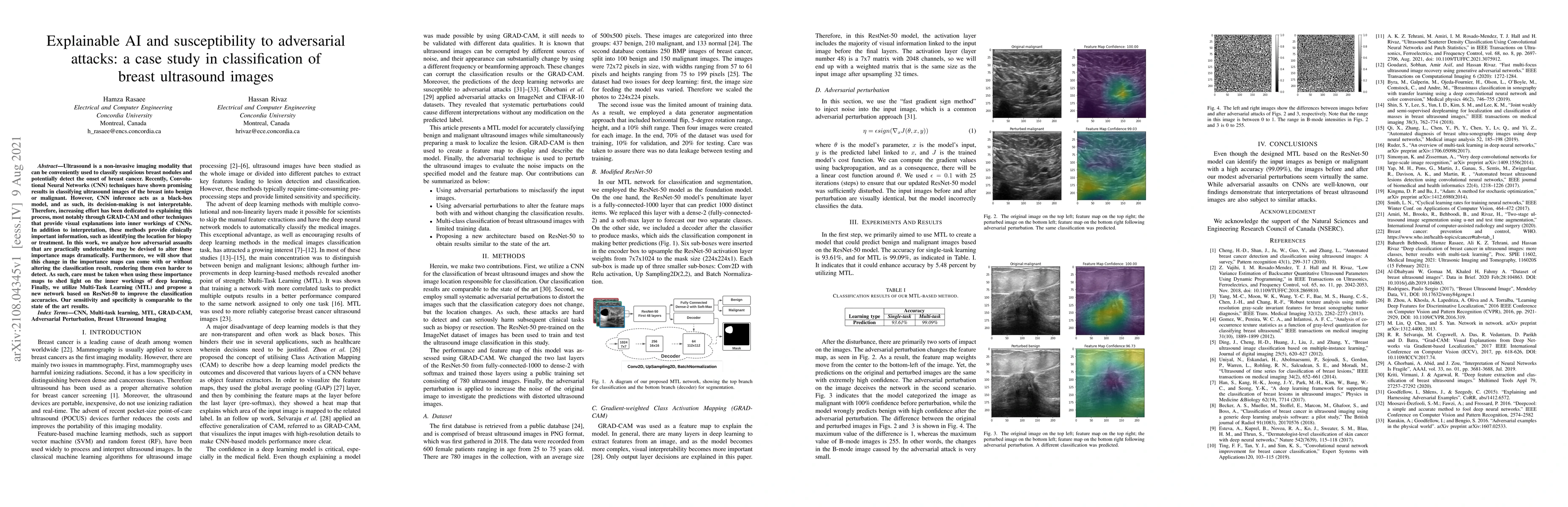Ultrasound is a non-invasive imaging modality that can be conveniently used to classify suspicious breast nodules and potentially detect the onset of breast cancer. Recently, Convolutional Neural Networks (CNN) techniques have shown promising results in classifying ultrasound images of the breast into benign or malignant. However, CNN inference acts as a black-box model, and as such, its decision-making is not interpretable. Therefore, increasing effort has been dedicated to explaining this process, most notably through GRAD-CAM and other techniques that provide visual explanations into inner workings of CNNs. In addition to interpretation, these methods provide clinically important information, such as identifying the location for biopsy or treatment. In this work, we analyze how adversarial assaults that are practically undetectable may be devised to alter these importance maps dramatically. Furthermore, we will show that this change in the importance maps can come with or without altering the classification result, rendering them even harder to detect. As such, care must be taken when using these importance maps to shed light on the inner workings of deep learning. Finally, we utilize Multi-Task Learning (MTL) and propose a new network based on ResNet-50 to improve the classification accuracies. Our sensitivity and specificity is comparable to the state of the art results.