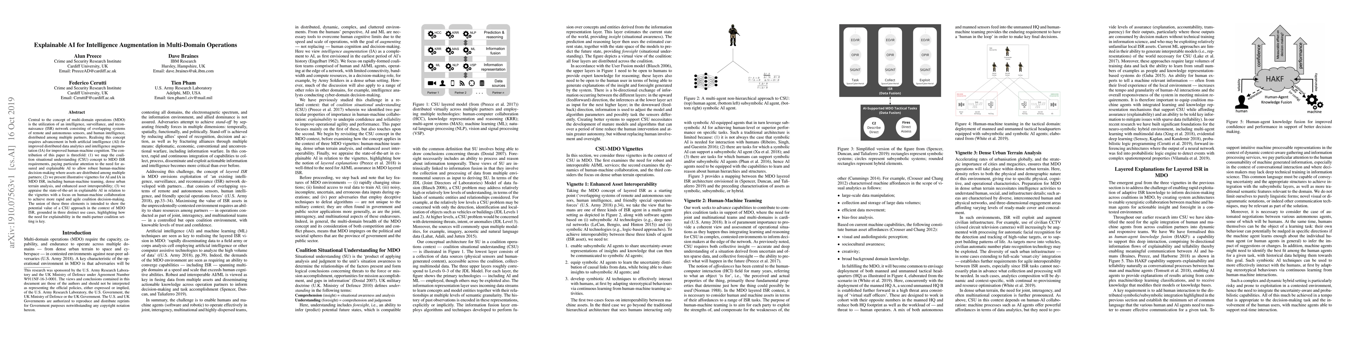 Central to the concept of multi-domain operations (MDO) is the utilization of an intelligence, surveillance, and reconnaissance (ISR) network consisting of overlapping systems of remote and autonomous sensors, and human intelligence, distributed among multiple partners. Realising this concept requires advancement in both artificial intelligence (AI) for improved distributed data analytics and intelligence augmentation (IA) for improved human-machine cognition. The contribution of this paper is threefold: (1) we map the coalition situational understanding (CSU) concept to MDO ISR requirements, paying particular attention to the need for assured and explainable AI to allow robust human-machine decision-making where assets are distributed among multiple partners; (2) we present illustrative vignettes for AI and IA in MDO ISR, including human-machine teaming, dense urban terrain analysis, and enhanced asset interoperability; (3) we appraise the state-of-the-art in explainable AI in relation to the vignettes with a focus on human-machine collaboration to achieve more rapid and agile coalition decision-making. The union of these three elements is intended to show the potential value of a CSU approach in the context of MDO ISR, grounded in three distinct use cases, highlighting how the need for explainability in the multi-partner coalition setting is key.