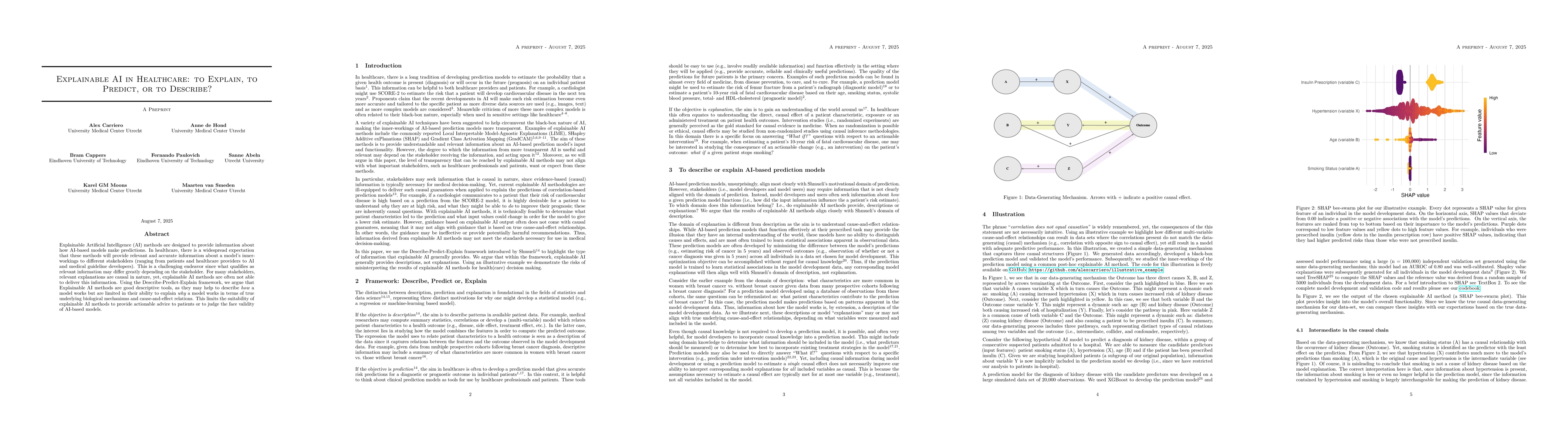 Explainable Artificial Intelligence (AI) methods are designed to provide information about how AI-based models make predictions. In healthcare, there is a widespread expectation that these methods will provide relevant and accurate information about a model's inner-workings to different stakeholders (ranging from patients and healthcare providers to AI and medical guideline developers). This is a challenging endeavour since what qualifies as relevant information may differ greatly depending on the stakeholder. For many stakeholders, relevant explanations are causal in nature, yet, explainable AI methods are often not able to deliver this information. Using the Describe-Predict-Explain framework, we argue that Explainable AI methods are good descriptive tools, as they may help to describe how a model works but are limited in their ability to explain why a model works in terms of true underlying biological mechanisms and cause-and-effect relations. This limits the suitability of explainable AI methods to provide actionable advice to patients or to judge the face validity of AI-based models.