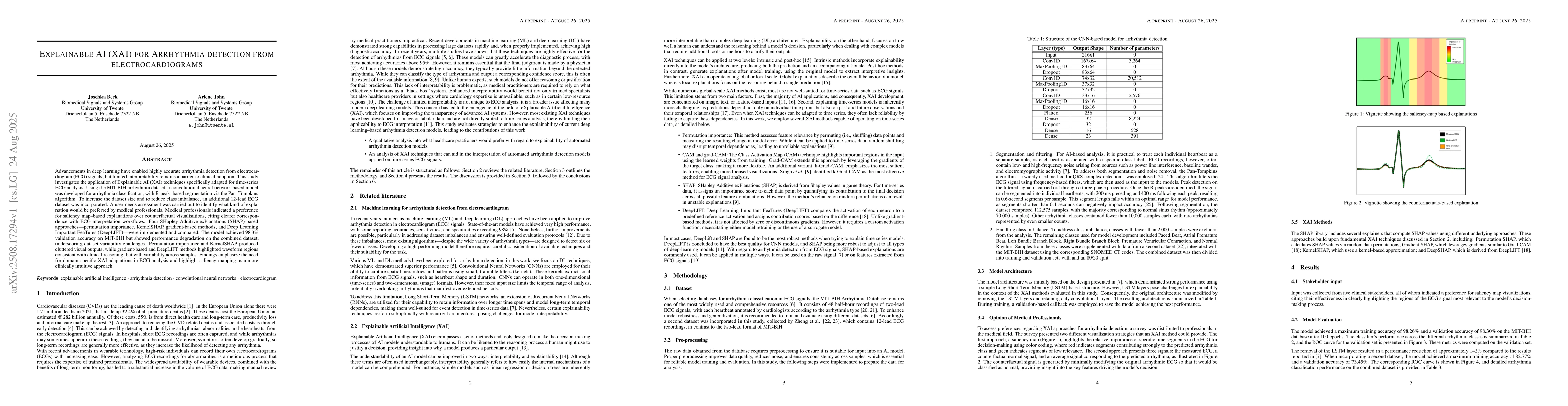 Advancements in deep learning have enabled highly accurate arrhythmia detection from electrocardiogram (ECG) signals, but limited interpretability remains a barrier to clinical adoption. This study investigates the application of Explainable AI (XAI) techniques specifically adapted for time-series ECG analysis. Using the MIT-BIH arrhythmia dataset, a convolutional neural network-based model was developed for arrhythmia classification, with R-peak-based segmentation via the Pan-Tompkins algorithm. To increase the dataset size and to reduce class imbalance, an additional 12-lead ECG dataset was incorporated. A user needs assessment was carried out to identify what kind of explanation would be preferred by medical professionals. Medical professionals indicated a preference for saliency map-based explanations over counterfactual visualisations, citing clearer correspondence with ECG interpretation workflows. Four SHapley Additive exPlanations (SHAP)-based approaches: permutation importance, KernelSHAP, gradient-based methods, and Deep Learning Important FeaTures (DeepLIFT), were implemented and compared. The model achieved 98.3% validation accuracy on MIT-BIH but showed performance degradation on the combined dataset, underscoring dataset variability challenges. Permutation importance and KernelSHAP produced cluttered visual outputs, while gradient-based and DeepLIFT methods highlighted waveform regions consistent with clinical reasoning, but with variability across samples. Findings emphasize the need for domain-specific XAI adaptations in ECG analysis and highlight saliency mapping as a more clinically intuitive approach