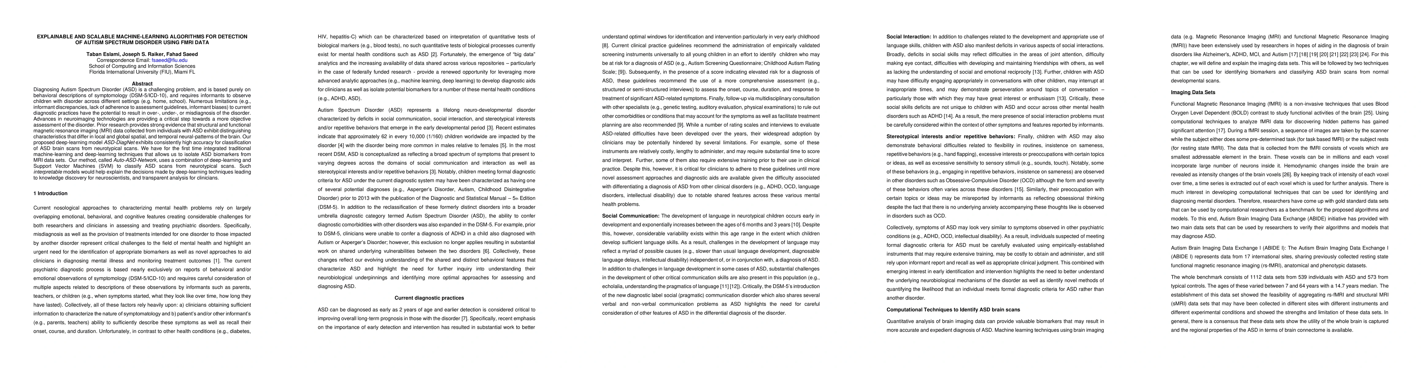 This paper proposes a scalable and explainable machine-learning model, ASD-DiagNet, for detecting Autism Spectrum Disorder using fMRI data. The Auto-ASD-Network combines deep-learning and SVM techniques to classify ASD scans, offering insights into neural patterns and improving diagnostic accuracy.